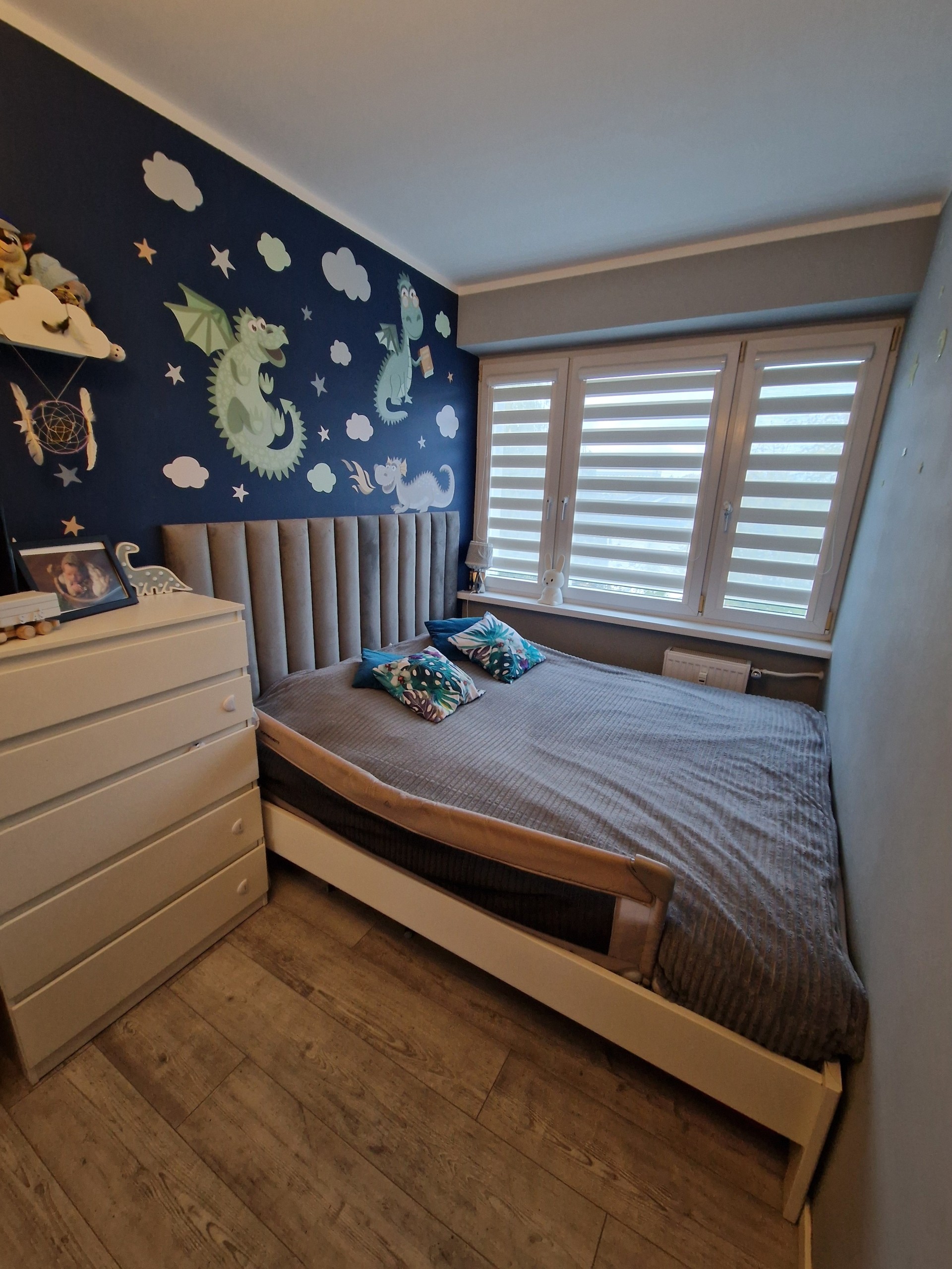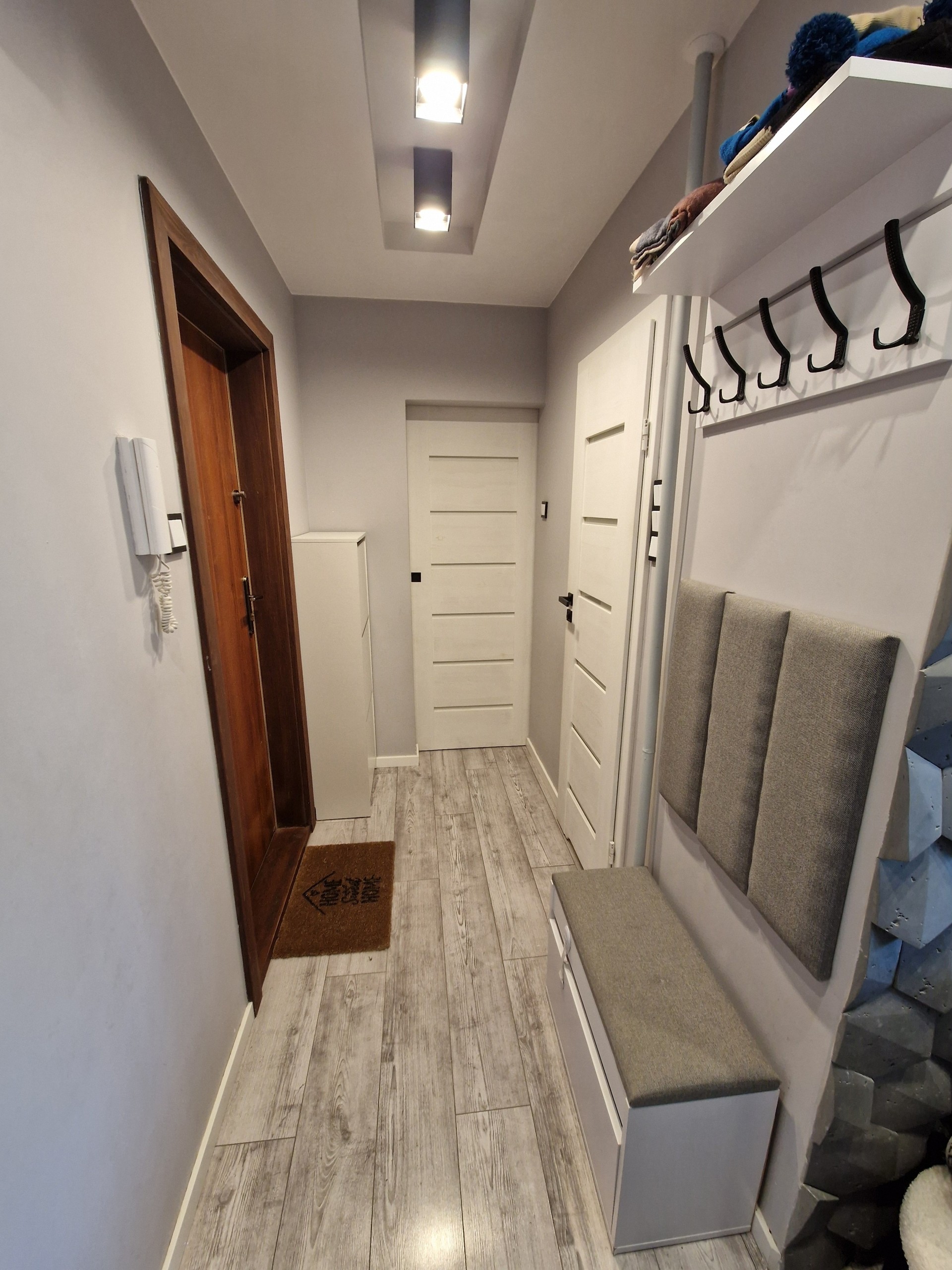 W przedpokoju dwie szafki i wieszak, a w sypialni łóżko , komoda oraz duża szafa w zabudowie.