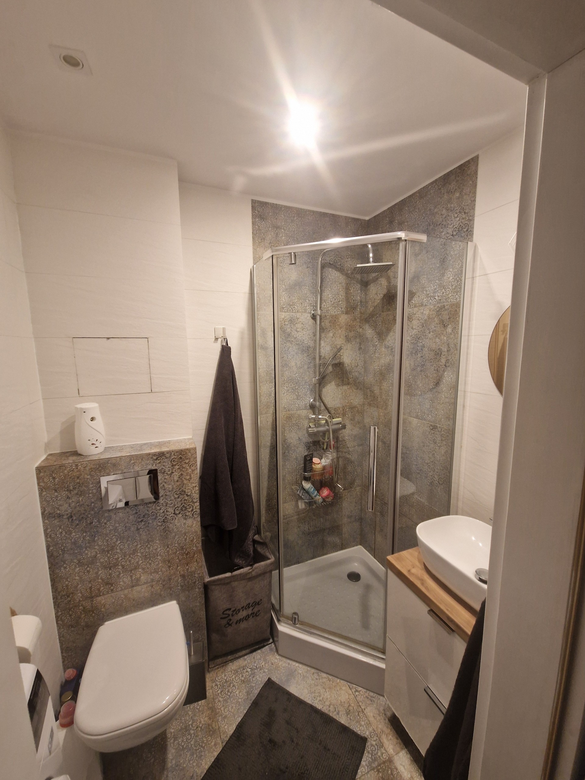 Łazienka w pełni wyposażona wraz z pralką.