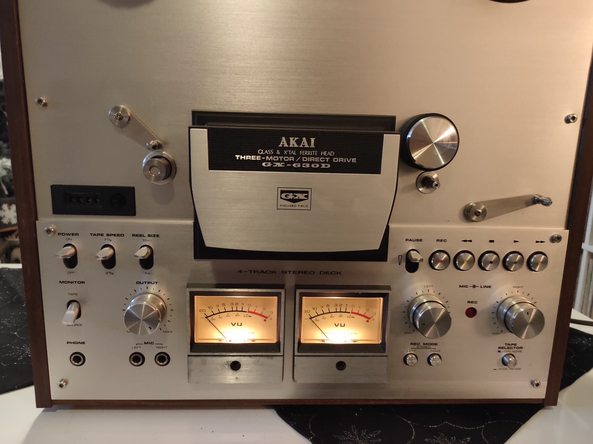 Akai GX-630D – magnetofon szpulowy 4-ścieżkowy, 3-głowicowy, z legendarnymi szklano-krystalicznymi głowicami GX o długiej żywotności. Prędkości 9,5 i 19 cm/s, stabilny napęd, analogowe wskaźniki VU. Bardzo dobre brzmienie i solidne wykonanie typowe dla klasycznych modeli Akai.