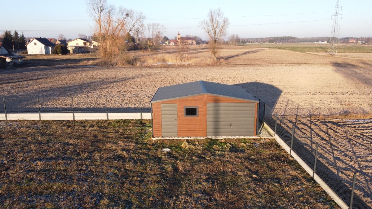 Na działce posadowiony blaszany garaż drewnopodobny o wymiarach 5m X 6m, z dwuspadowym dachem, bramą garażową oraz drzwiami technicznymi.
