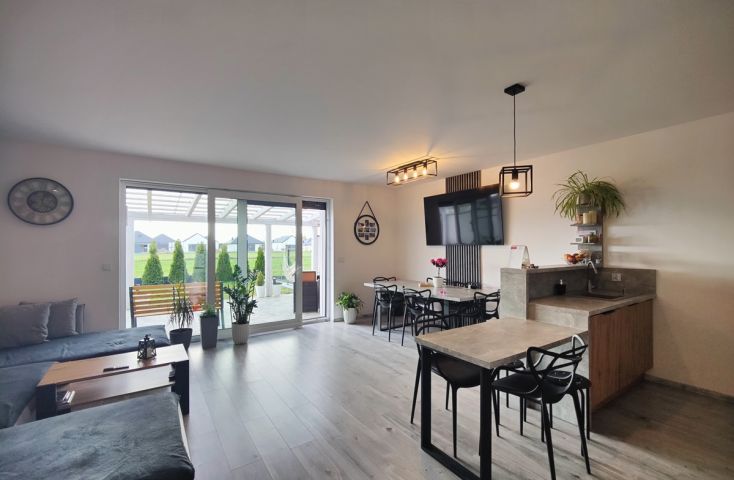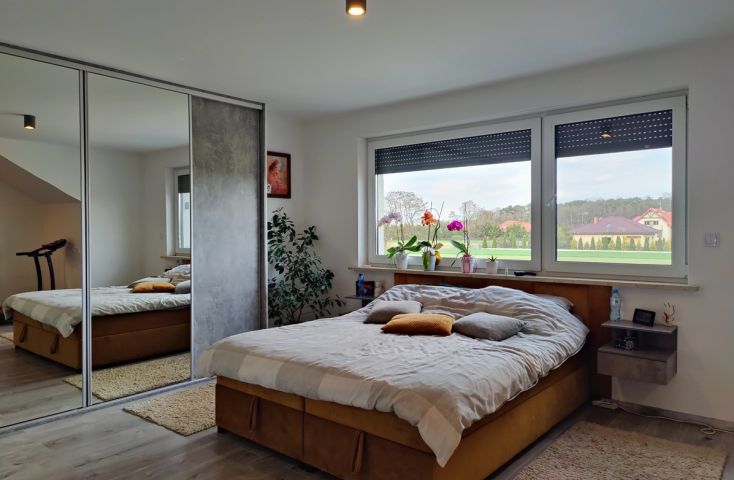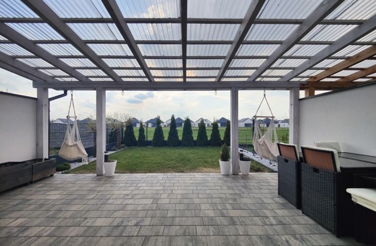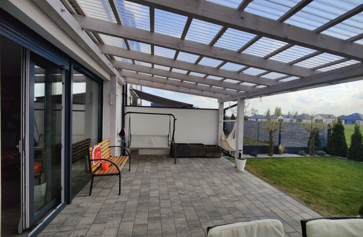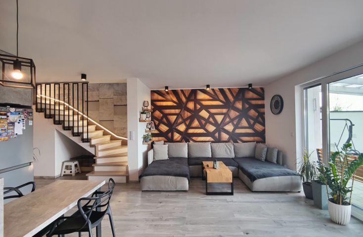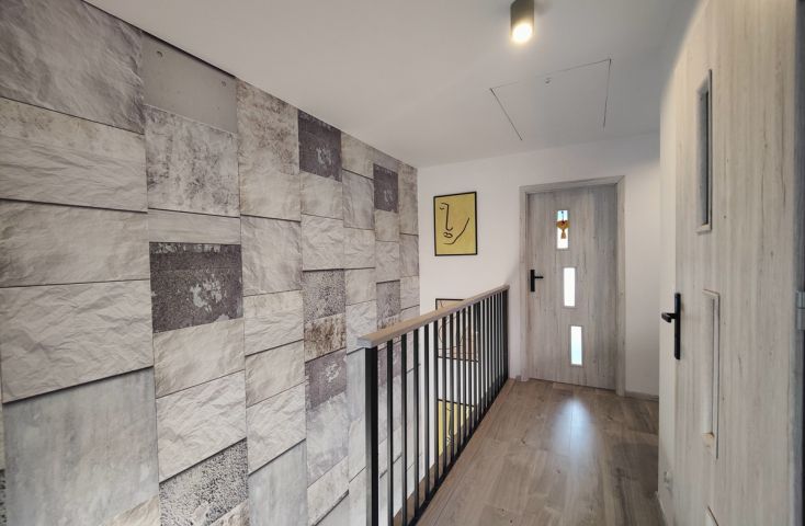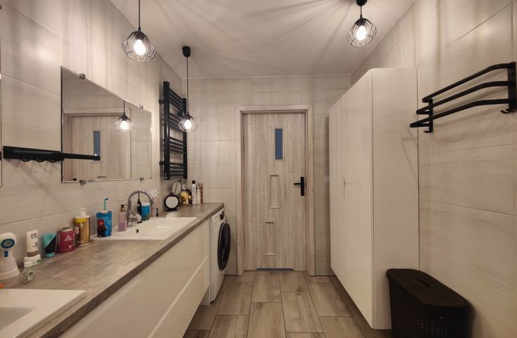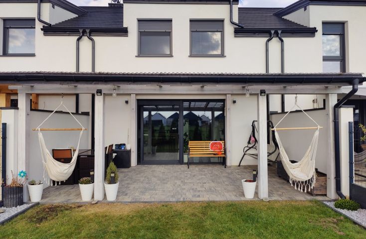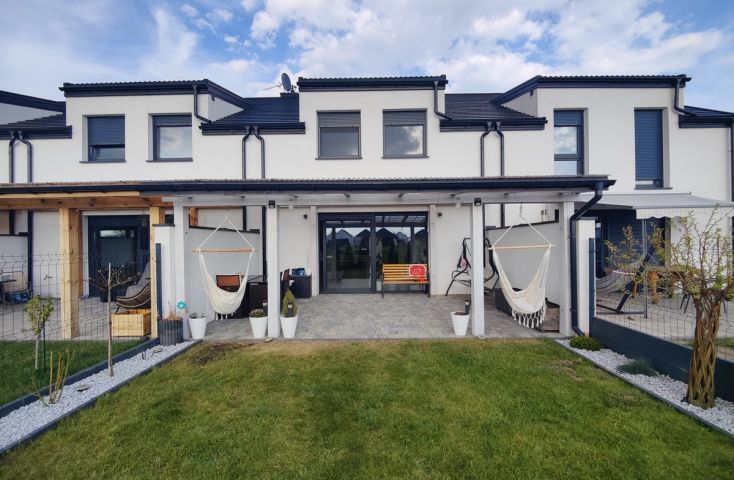 Na sprzedaż nowy, wykończony dom w zabudowie szeregowej, zlokalizowany w miejscowości Żychlin, przy ul. Staromiejskiej, gm. Stare Miasto.Powierzchnia i typ zabudowy:Budynek mieszkalny wybudowany w 2022 r., o powierzchni użytkowej 120,96 m2 (102,61 m2 powierzchni mieszkalnej + 18,35 m2 garaż z kotłownią), parterowy z poddaszem użytkowym, z garażem w bryle budynku, w zabudowie szeregowej. Wyszczególnienie pomieszczeń:- parter: wiatrołap (4,22 m2), holl (7,08 m2), łazienka z prysznicem i wc (2,40 m2), salon z aneksem kuchennym (30,35 m2), pom. gosp./kotłownia (3,25 m2), garaż (15,10 m2),- poddasze: korytarz (7,47 m2), pokój (9,95 m2), pokój (9,95 m2), sypialnia (19,93 m2), łazienka z wanną i wc (8,06 m2). Technologia budownictwa:Budynek murowany z cegły betonu komórkowego (Ytong), ocieplony styropianem grubości 20 cm, elewacja pokryta tynkiem. Dach dwuspadowy, konstrukcji drewnianej, pokryty dachówką. Stolarka okienna PCV trzyszybowa pięciokomorowa w kolorze antracyt z zewnątrz i białym wewnątrz, rolety zewnętrzne elektrycznie unoszone. Stan techniczny i standard wykończenia:Wnętrze domu wykończone bardzo dobrym standardzie. Salon z aneksem kuchennym urządzony w odcieniach szarości i drewna dodającego ciepłego klimatu. Ozdobą części dziennej są podświetlane schody z drewnianymi stopniami i czarną metalową balustradą. Podłogi w większości wyłożone jednolitymi spójnymi panelami, w łazienkach i wiatrołapie wyłożone terakotą. Ściany pokryte gładzią szpachlową, w salonie i na klatce schodowej wyłożone ozdobną tapetą, w łazienkach wyłożone glazurą. Dom wyposażony w zabudowę meblową kuchenną wraz ze sprzętem AGD (płyta grzewcza gazowa, piekarniki w zabudowie, zmywarka), szafę w zabudowie w wiatrołapie, dużą szafę w zabudowie w sypialni oraz dużą sz... więcej na www.invicus.pl, oferta nr 4548.