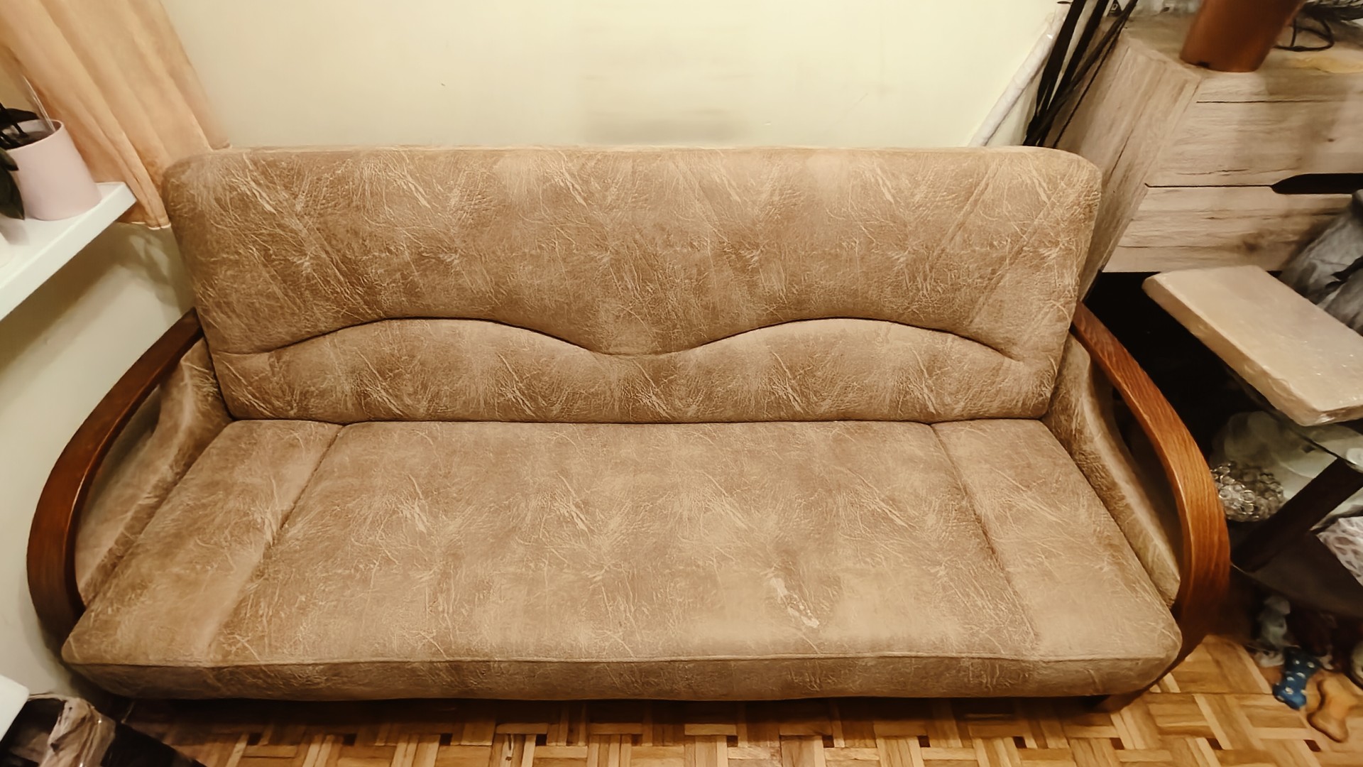 Sprzedam wersalkę w kolorze jasnym ("kawa z mlekiem"), z funkcją spania. Cześć rozkładana jest sprawna. Stan wersalki mogę określić jako bardzo dobry, nie uszkodzona.