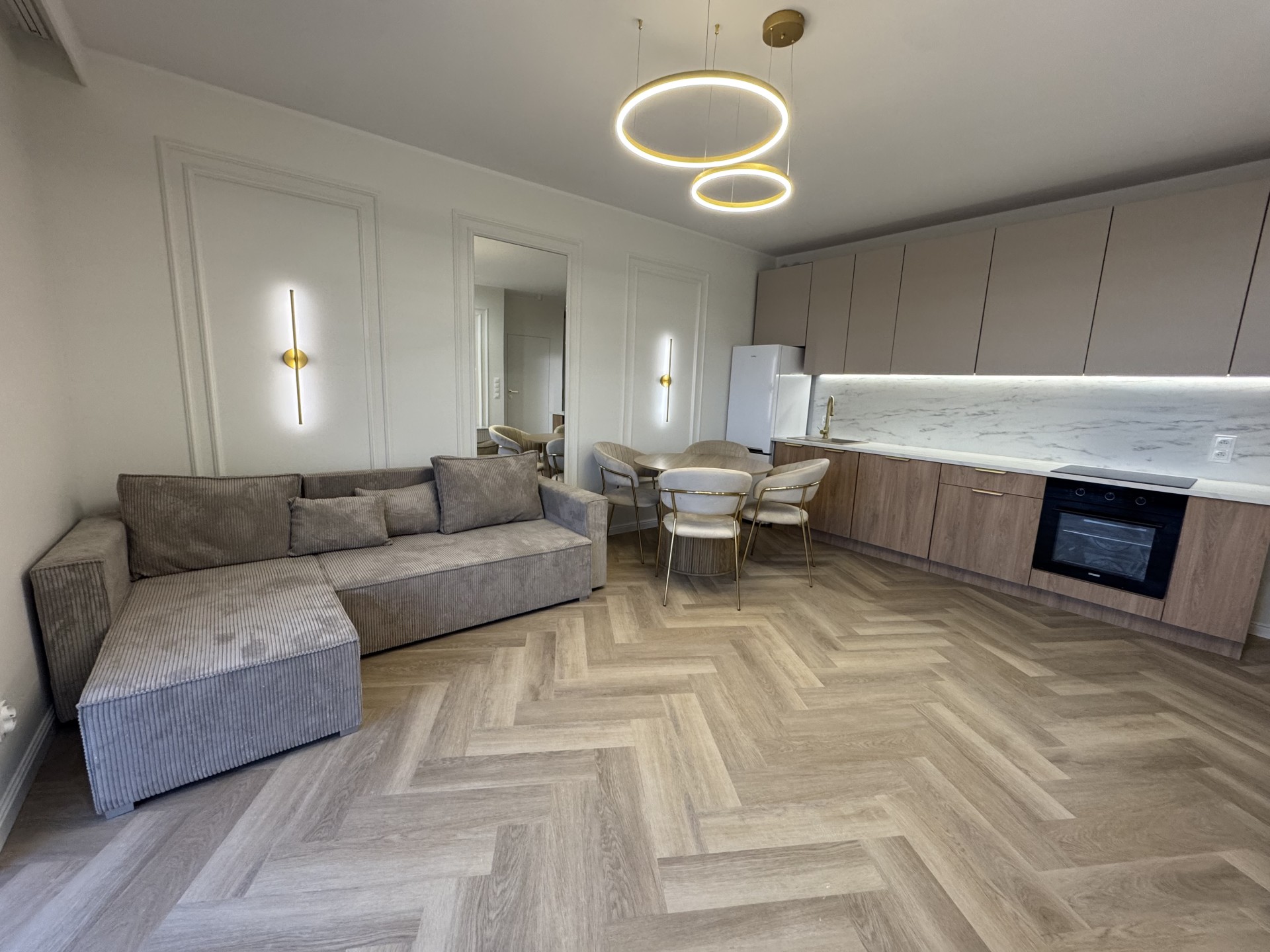 Kuchnia wyposażona w sprzęt AGD: lodówka, zmywarka, piekarnik, indukcja, okap.