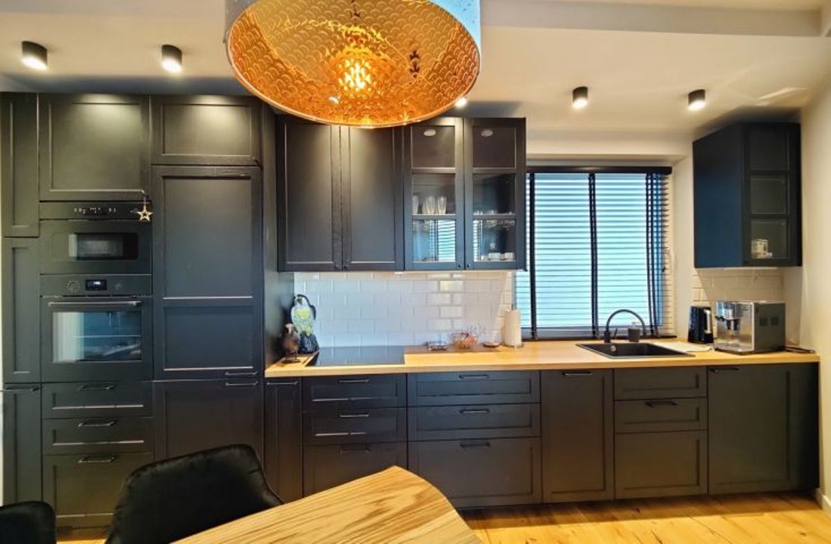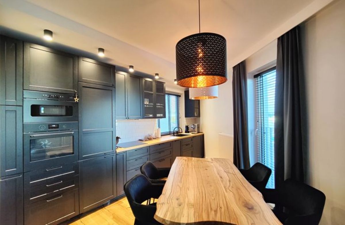 - w kuchni: zabudowa meblowa kuchenna wraz ze sprzętem AGD (zmywarka, lodówka, piekarnik w zabudowie, płyta indukcyjna, mikrofala), stół z krzesłami;