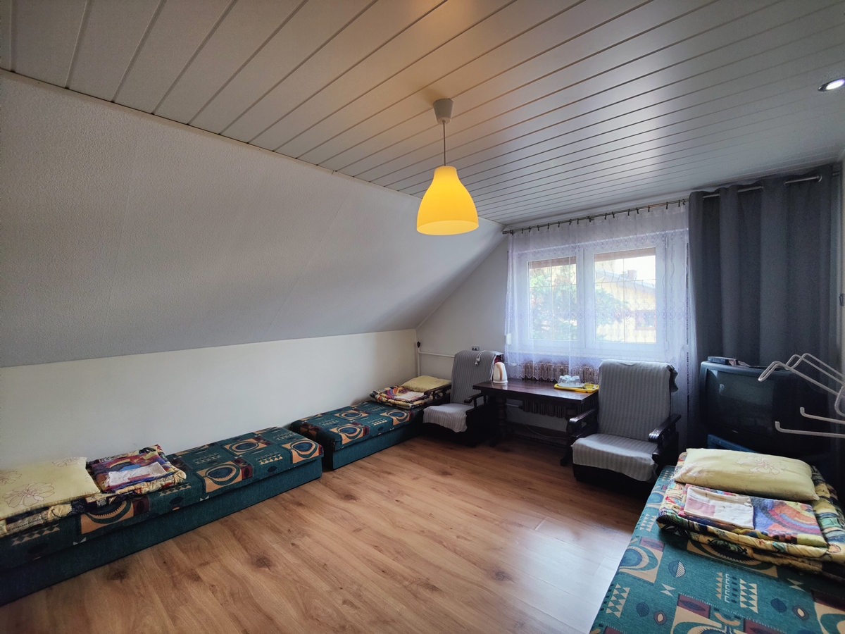 - poddasze użytkowe: klatka schodowa, przedpokój, 3 duże pokoje noclegowe, 1 mały pokój noclegowy/schowek, łazienka z wanną, prysznicem i wc, osobne wc,