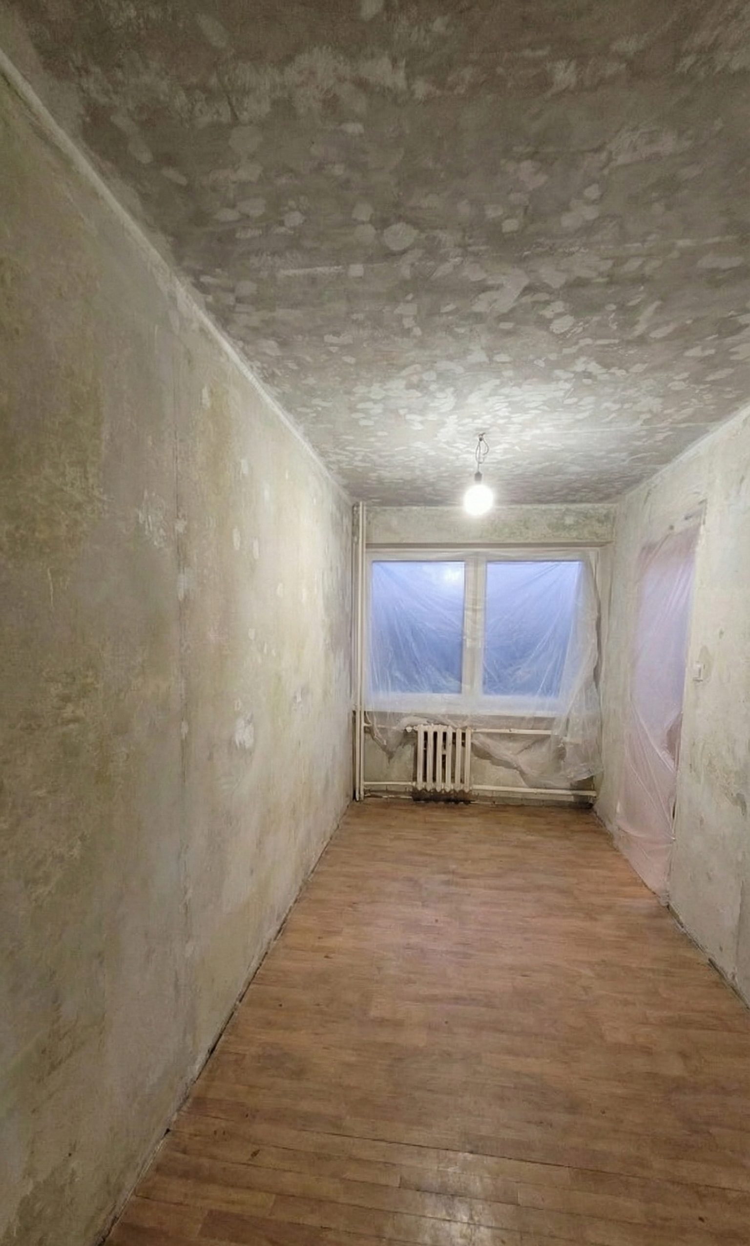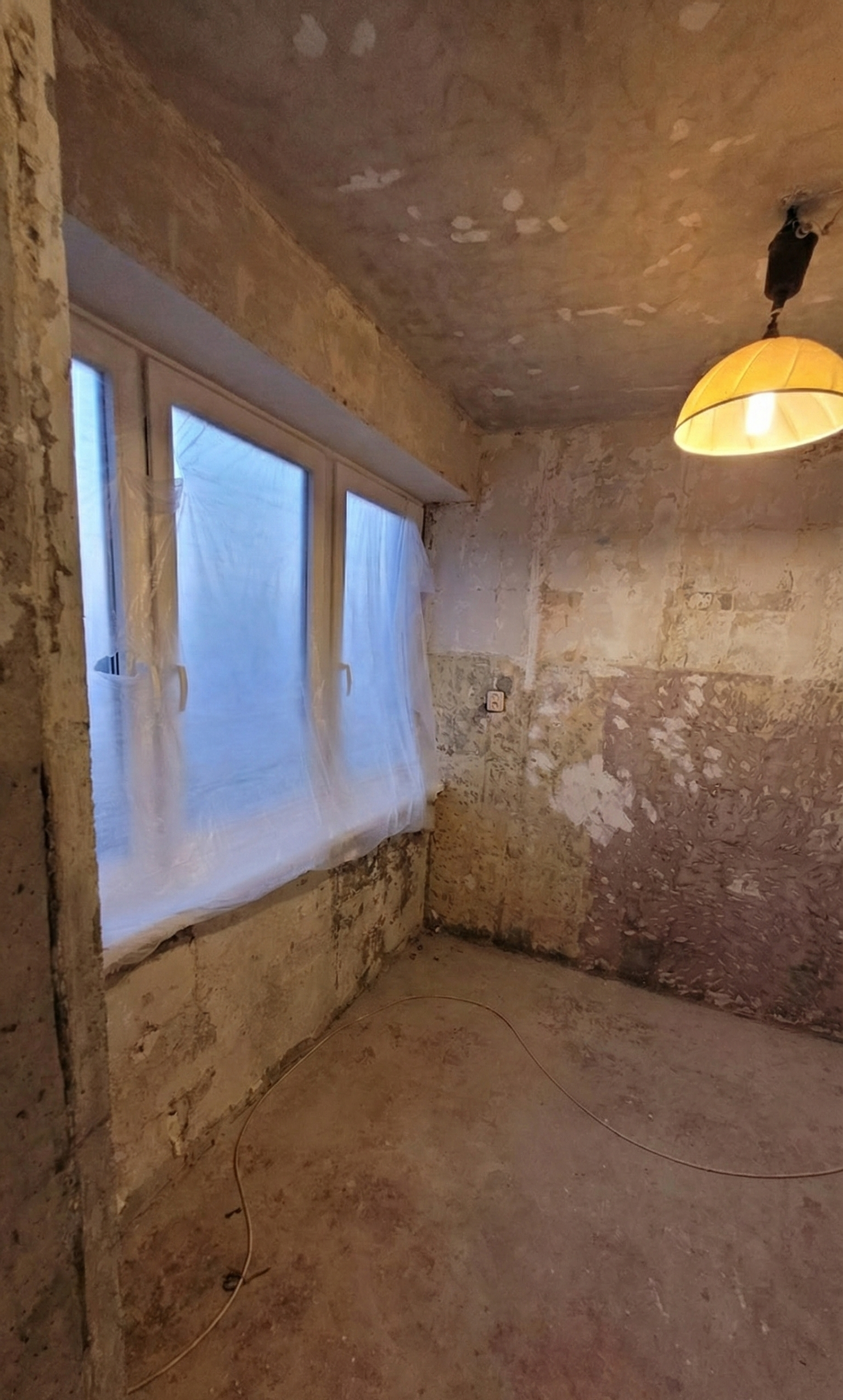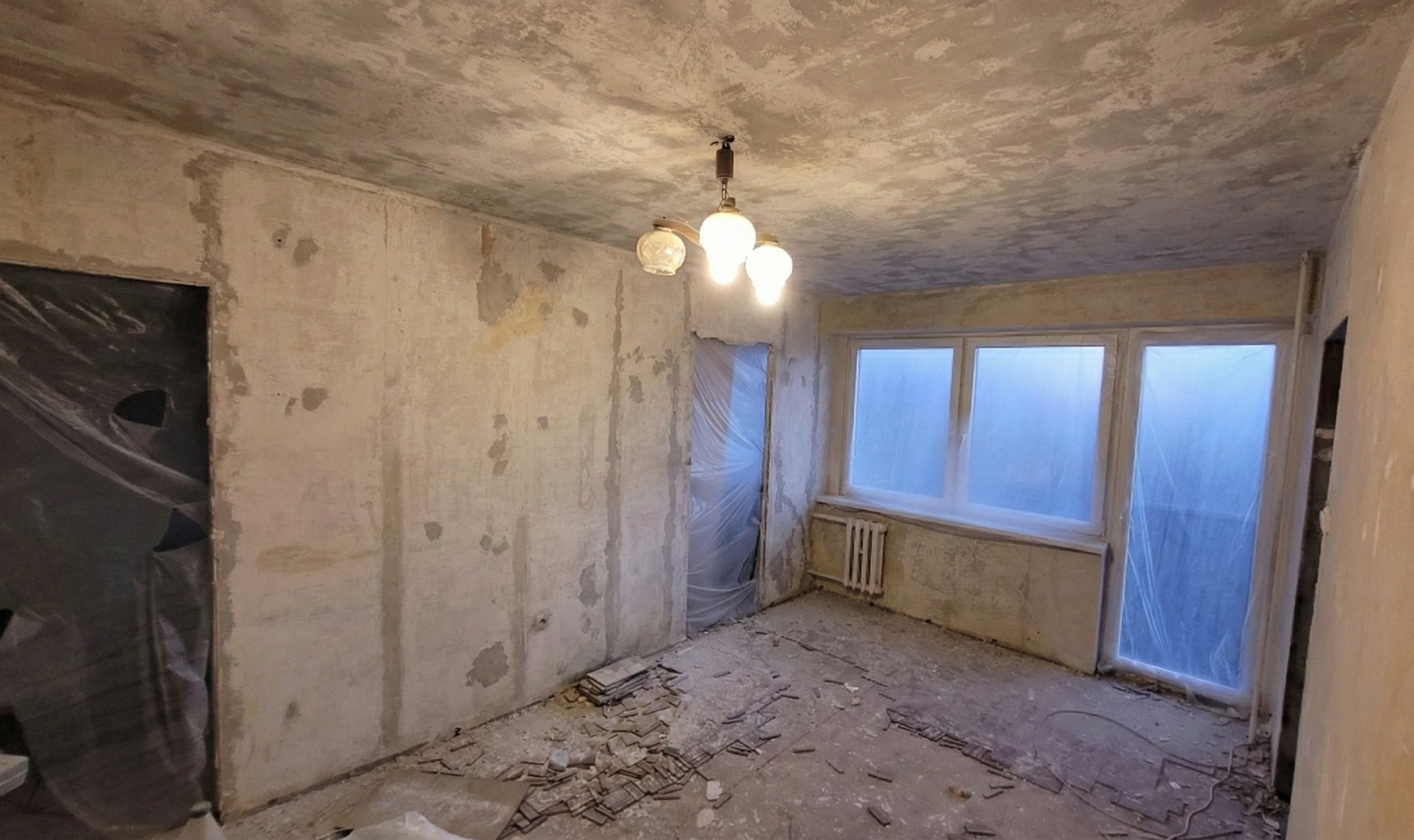 Ściany: Zdarte stare tapety i inne warstwy. Wykonane zaprawki, przygotowane bezpośrednio pod gładzie. Tak samo z sufitów.