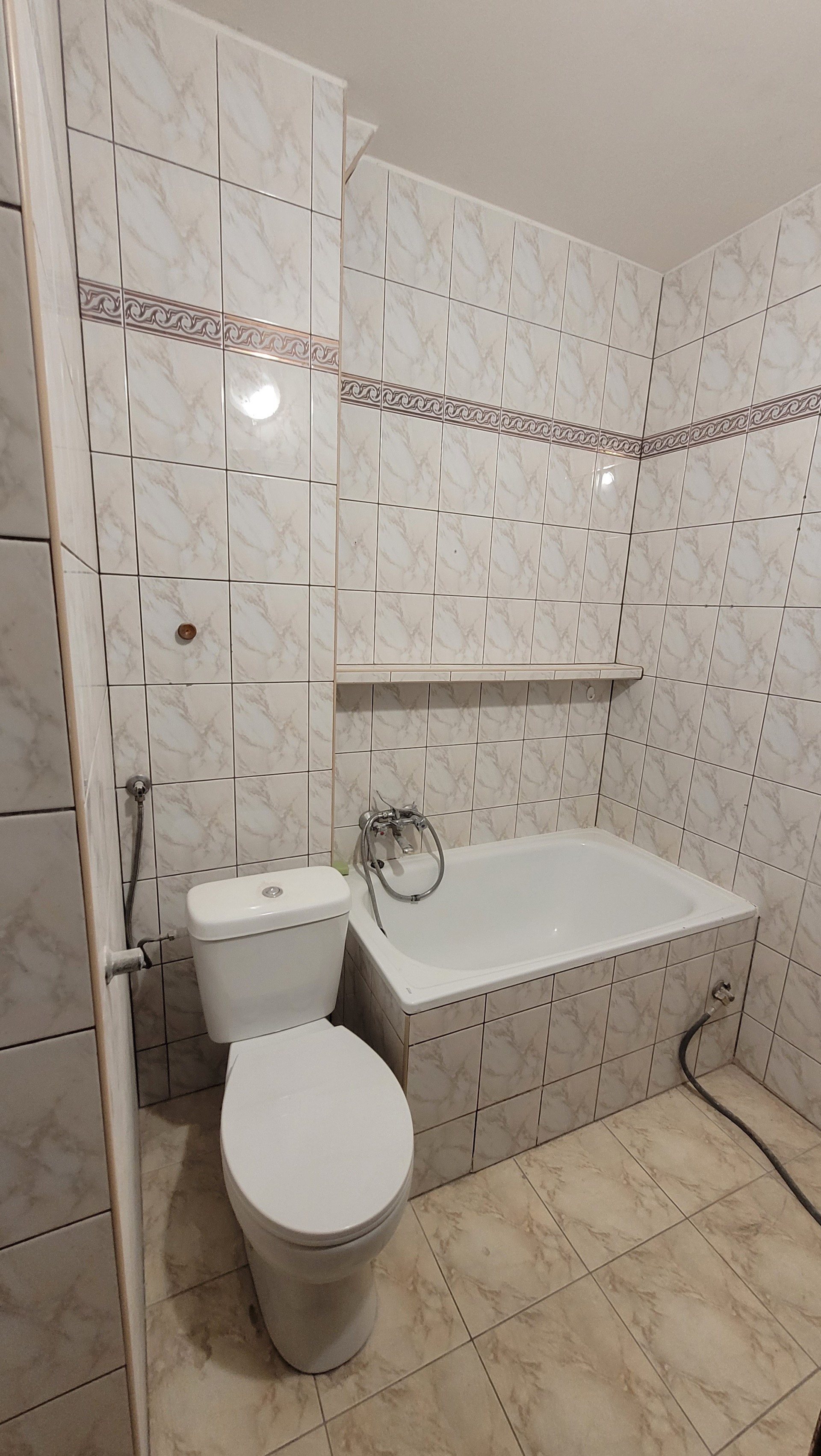 Łazienka: Sufit położona gładź, przygotowany do malowania, wstawiony nowy kompakt WC.