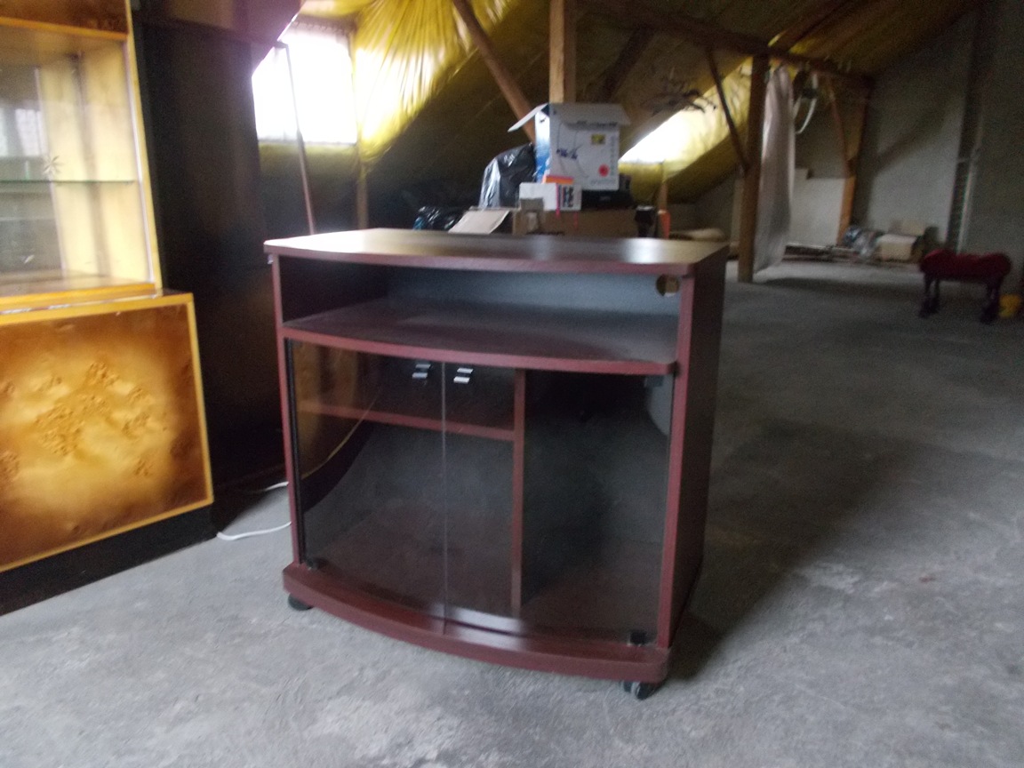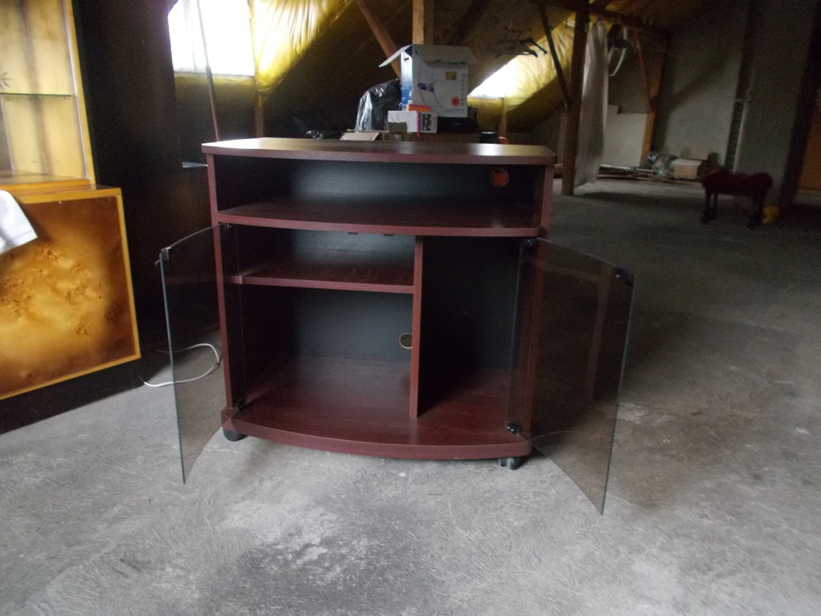 Sprzedam ładną szafkę w bardzo dobrym stanie. Wymiary: szerokość 80 cm, głębokość 48 cm, wysokość 76 cm. W szafce są dwie poziome półki. Z przodu są drzwiczki z ciemnego szkła, a całość stoi na kółkach. Szafka może służyć jako stolik pod media np. telewizor. Polecam.