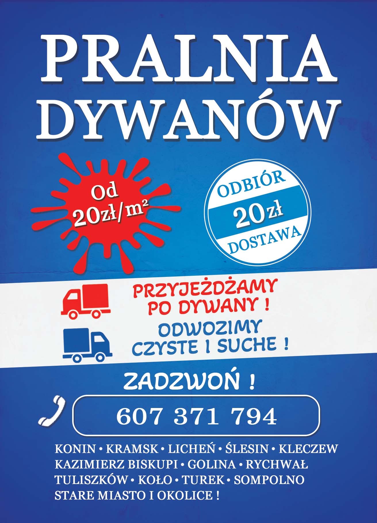 Pralnia dywanów. Przyjeżdżamy po dywany, odwozimy czyste i suche. Konin i okolice. Jako jedyna pralnia w Koninie specjalizujemy się w praniu dywanów metodą "NA WSKROŚ". Jest to najskuteczniejsza z metod pralniczych, która polega na dogłębnym, obustronnym praniu dywanu. Cena już od 20 zł za metr kwadratowy. Codziennie wyjeżdżamy po dywany. Tel. 607 371 794