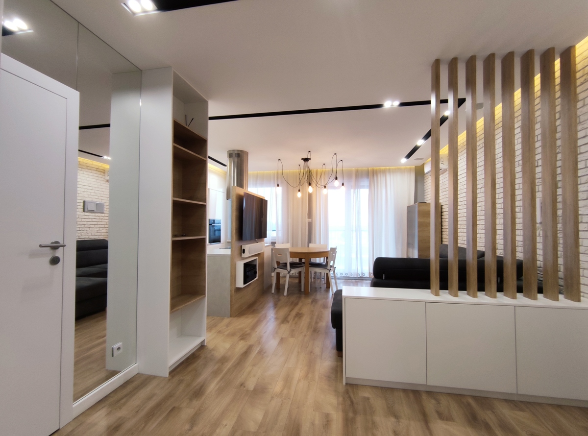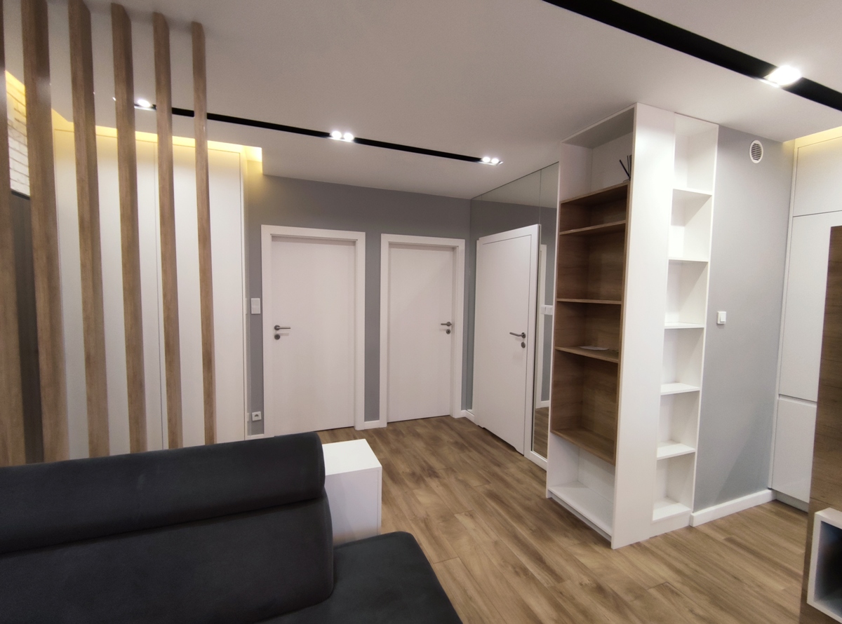 Wnętrze mieszkania urządzone w stylu nowoczesnym, jasne i przestrzenne. Stonowane kolory bieli, beżu, szarości oraz czerni pojawiają się naprzemiennie nie tylko na podłogach i ścianach, ale także meblach, elementach oświetlenia czy zastosowanych tkaninach. Wszelkie meble, regały, szafy, wygodne łóżka są nie tylko funkcjonalne ale zaskakują również swoją designerską formą.