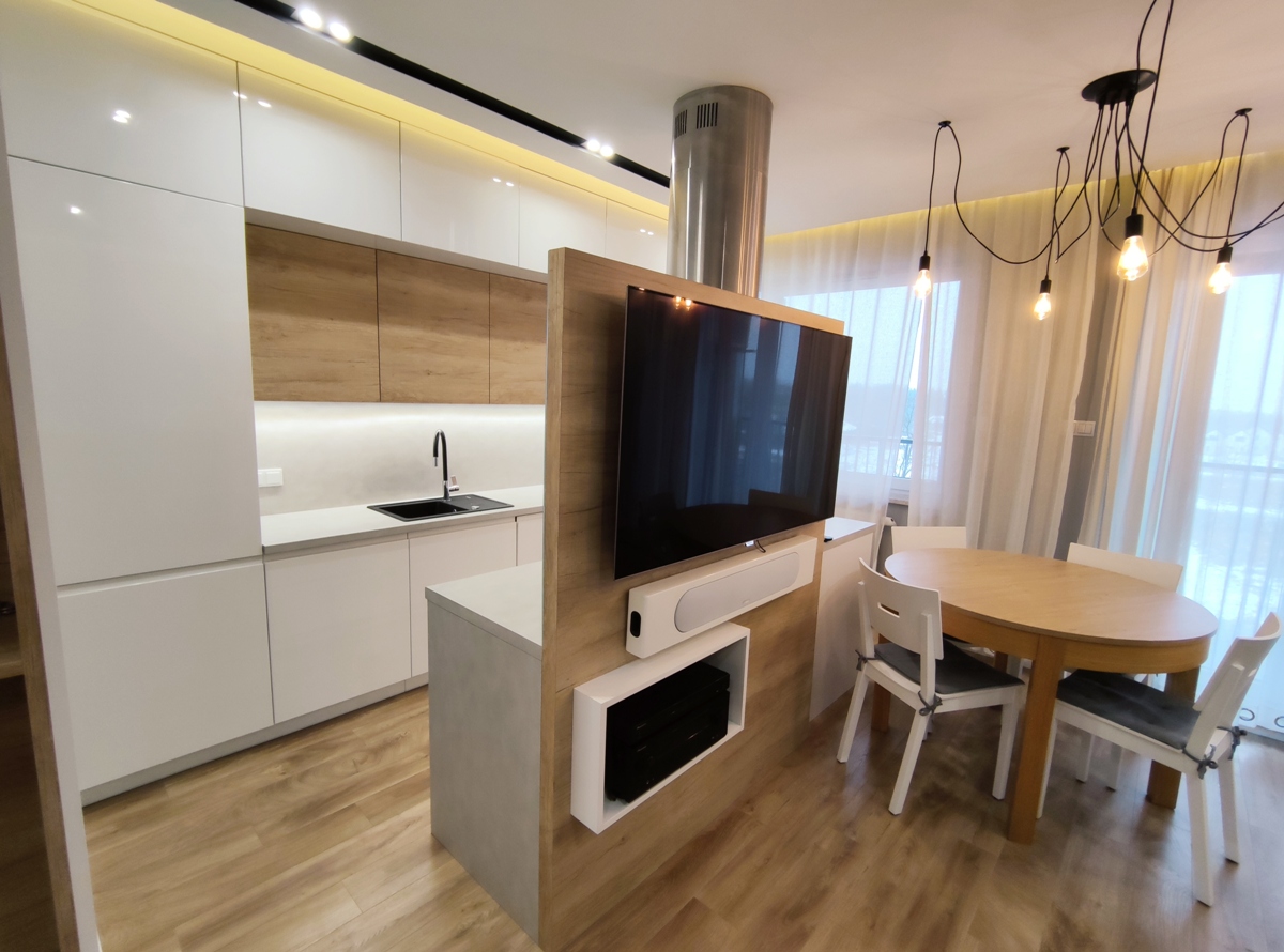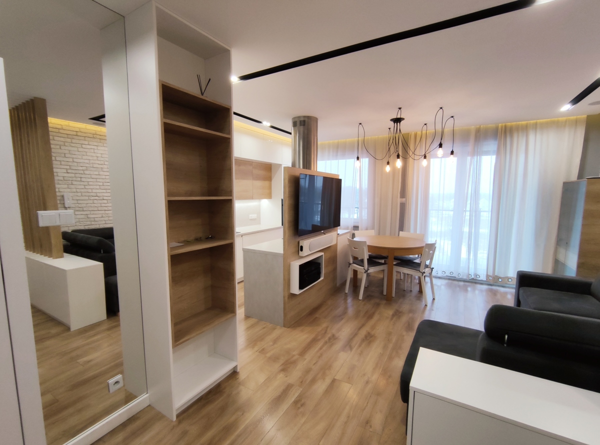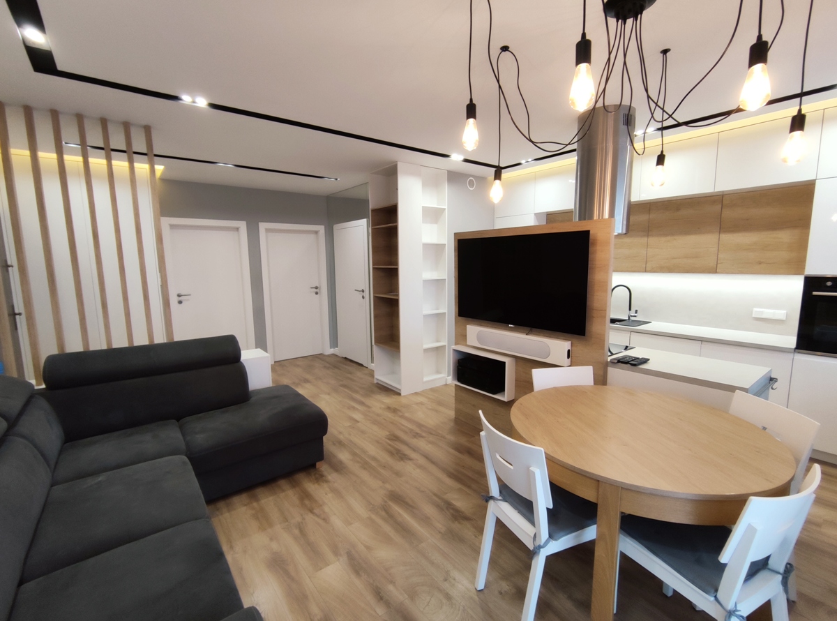Mieszkanie w pełni umeblowane i wyposażone, w zabudowie kuchennej: zmywarka, płyta indukcyjna, piekarnik, lodówka; w salonie oraz sypialni telewizor; w łazience pralka, wanna i prysznic. Do dyspozycji najemcy wszelkie widoczne na zdjęciach umeblowanie typu: narożnik, łoże sypialniane, łóżko w drugim pokoju, szafy, komody, regały, biurko, stół, krzesła.