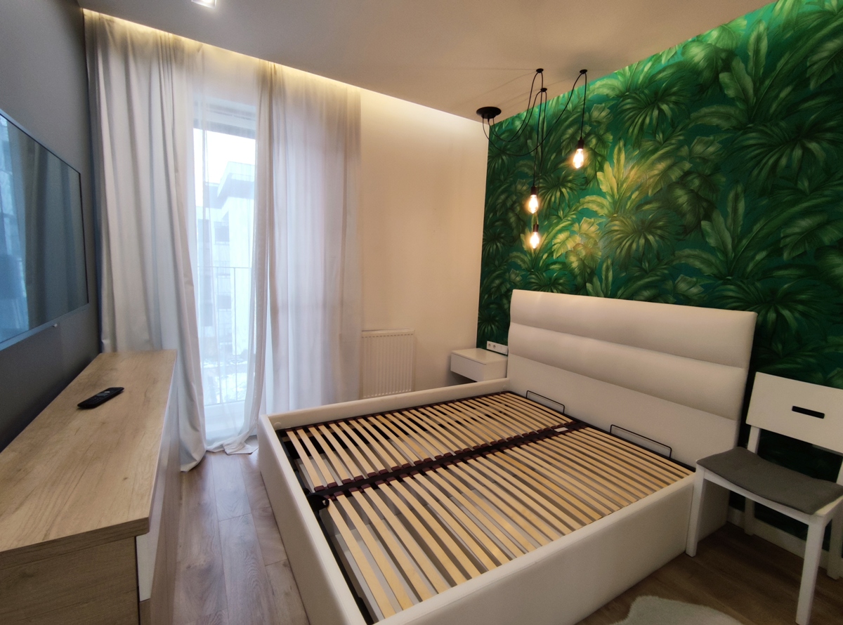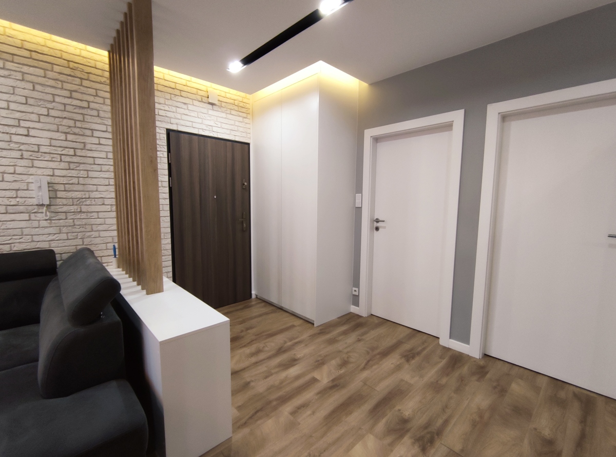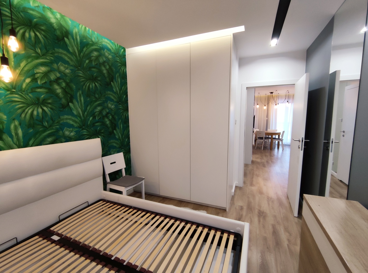 Mieszkanie w pełni umeblowane i wyposażone, w zabudowie kuchennej: zmywarka, płyta indukcyjna, piekarnik, lodówka; w salonie oraz sypialni telewizor; w łazience pralka, wanna i prysznic. Do dyspozycji najemcy wszelkie widoczne na zdjęciach umeblowanie typu: narożnik, łoże sypialniane, łóżko w drugim pokoju, szafy, komody, regały, biurko, stół, krzesła.