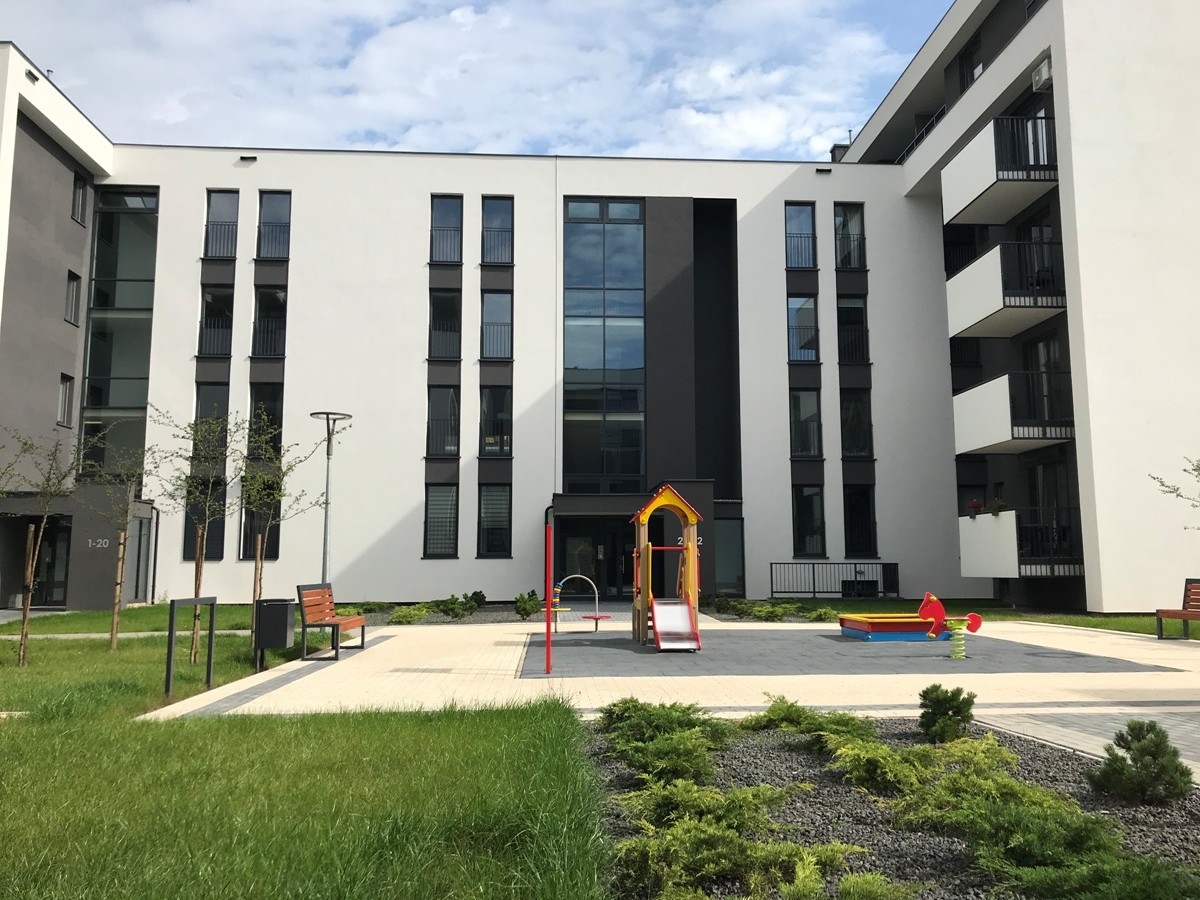 Zagospodarowanie terenu wokół budynku zaspokaja potrzebę ruchu i bezpieczeństwa najmłodszych dzieci (plac zabaw) oraz spokój i wytchnienie dla osób dorosłych (liczne nasadzenia drzew i krzewów ozdobnych, wygodne ławki).