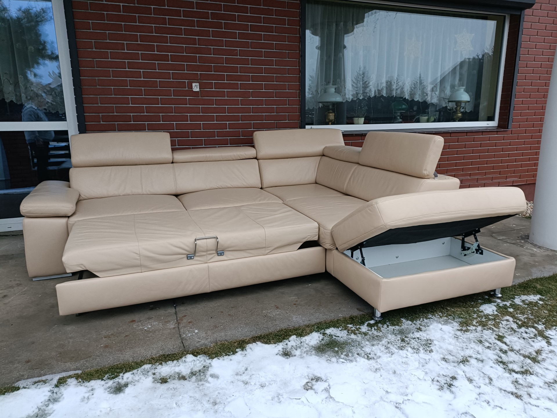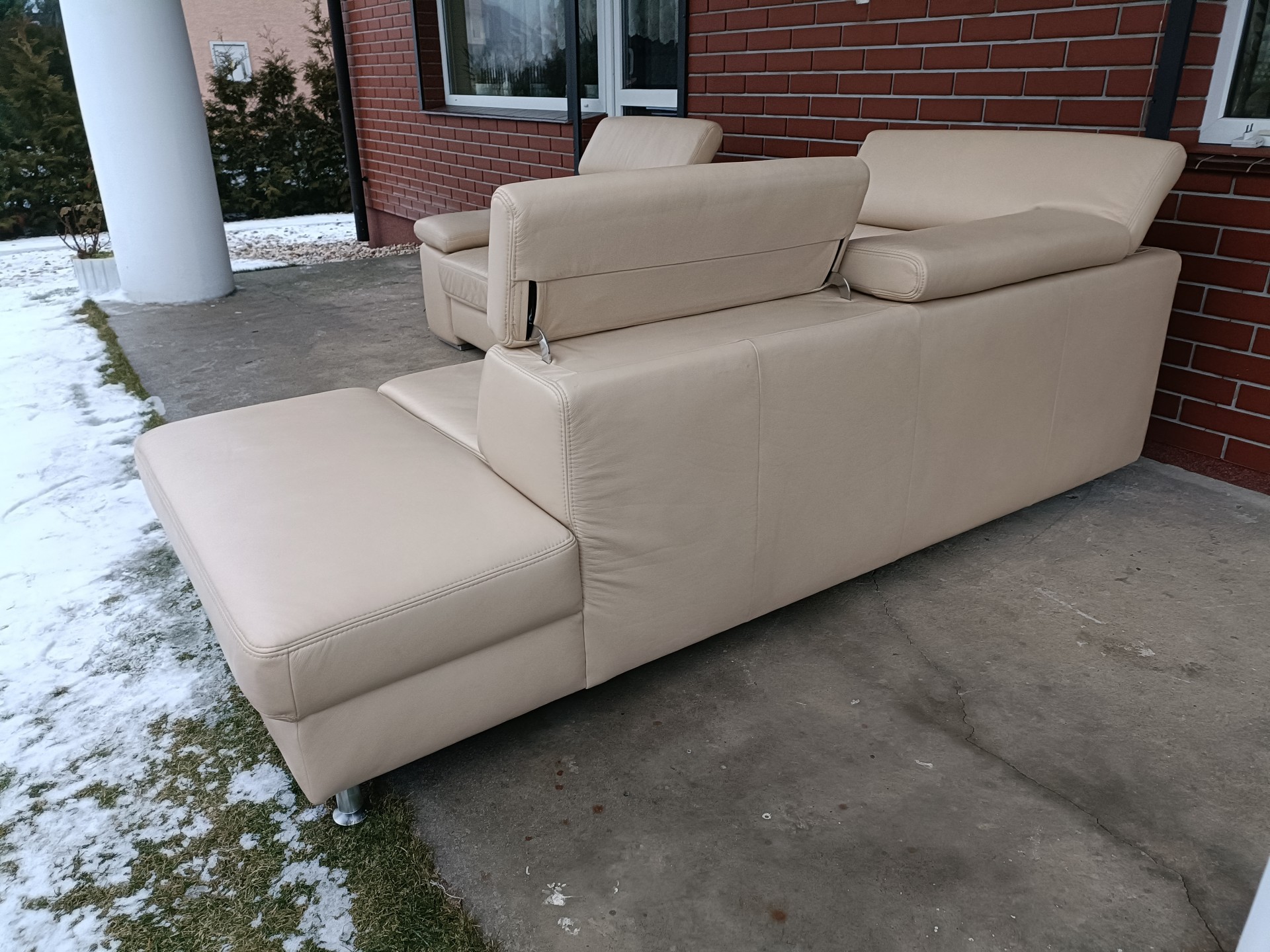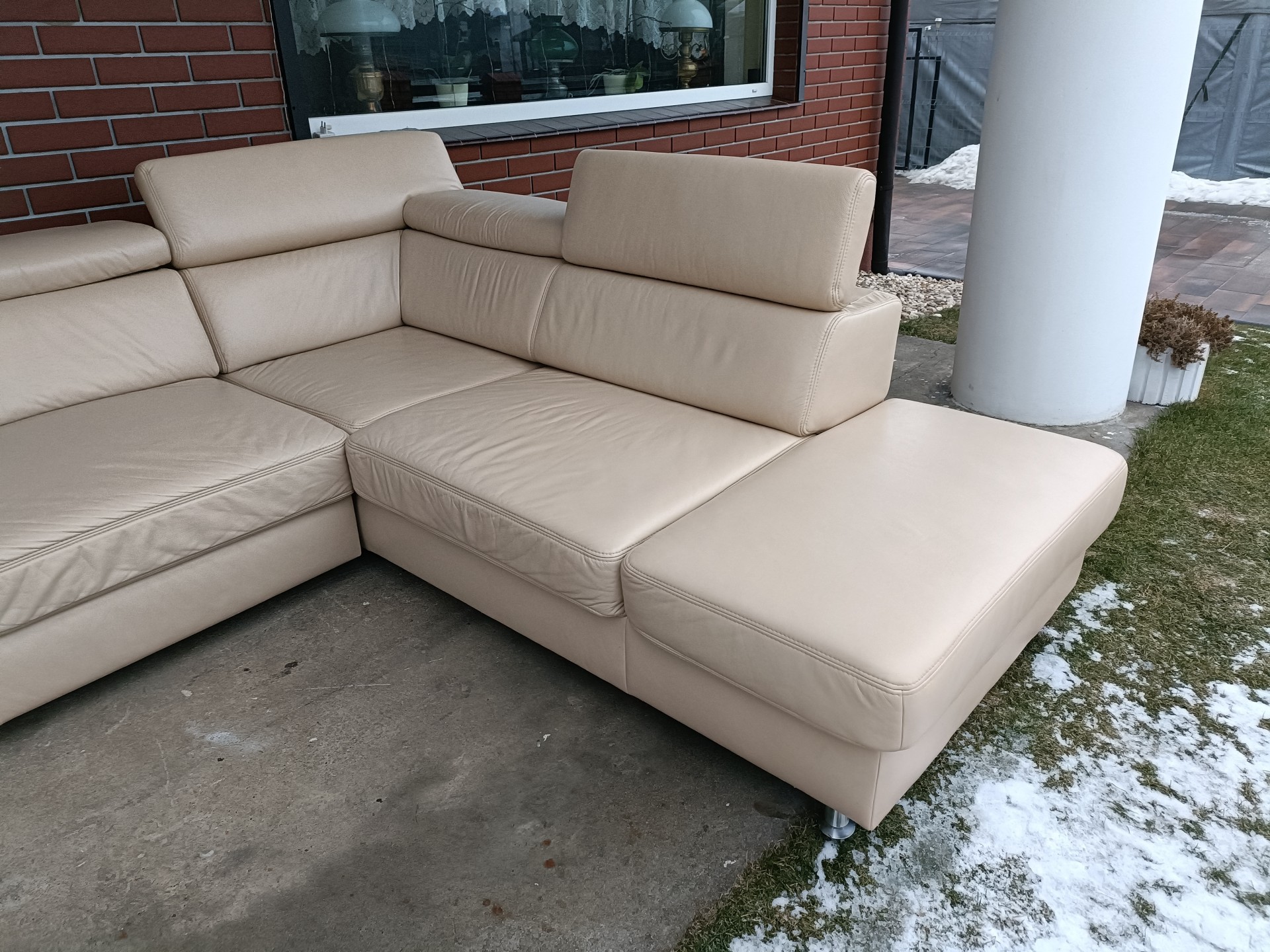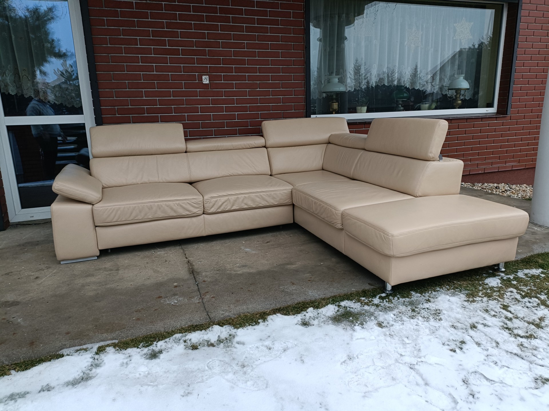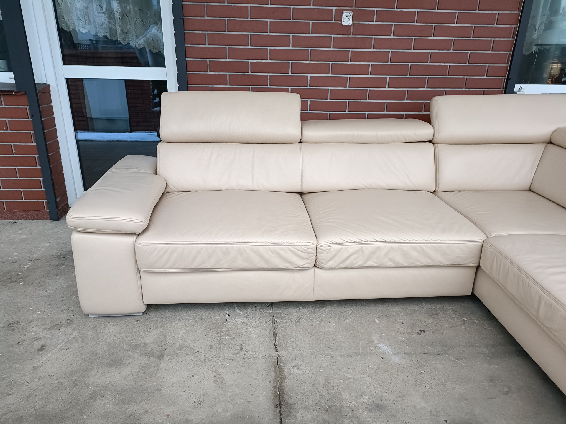 Sprzedam narożnik ze skóry kolor ecru wymiary 270 na 220 narożnik posiada regulowane zagłówki i podłokietnik, posiada funkcję spania i pojemnik na pościel stan bdb