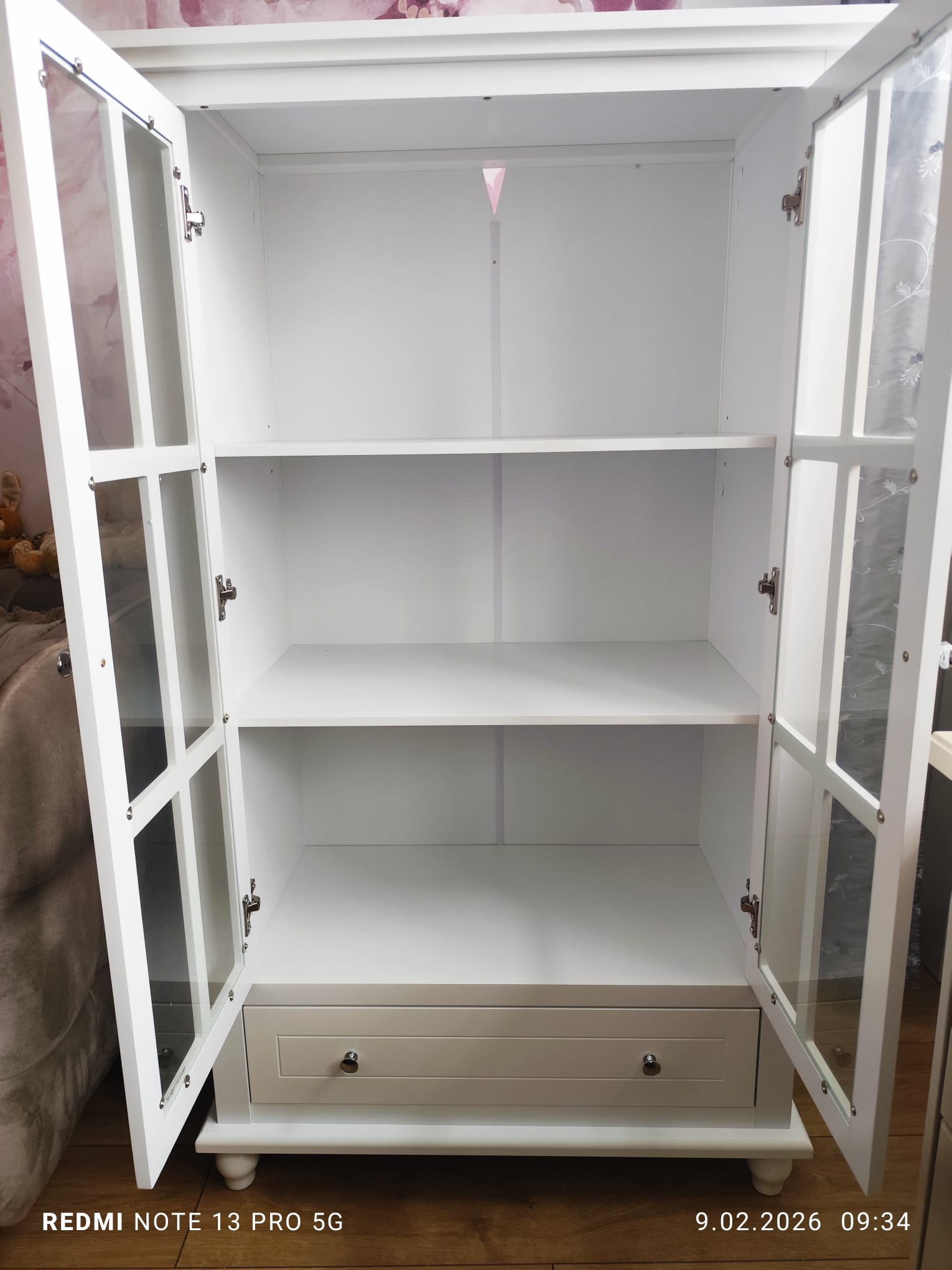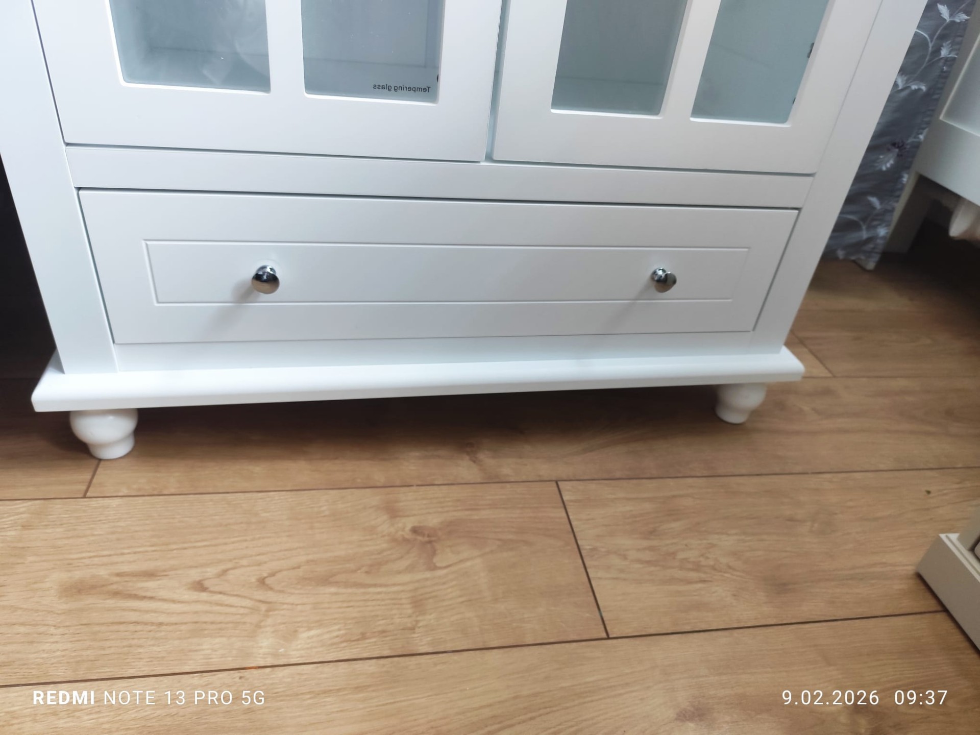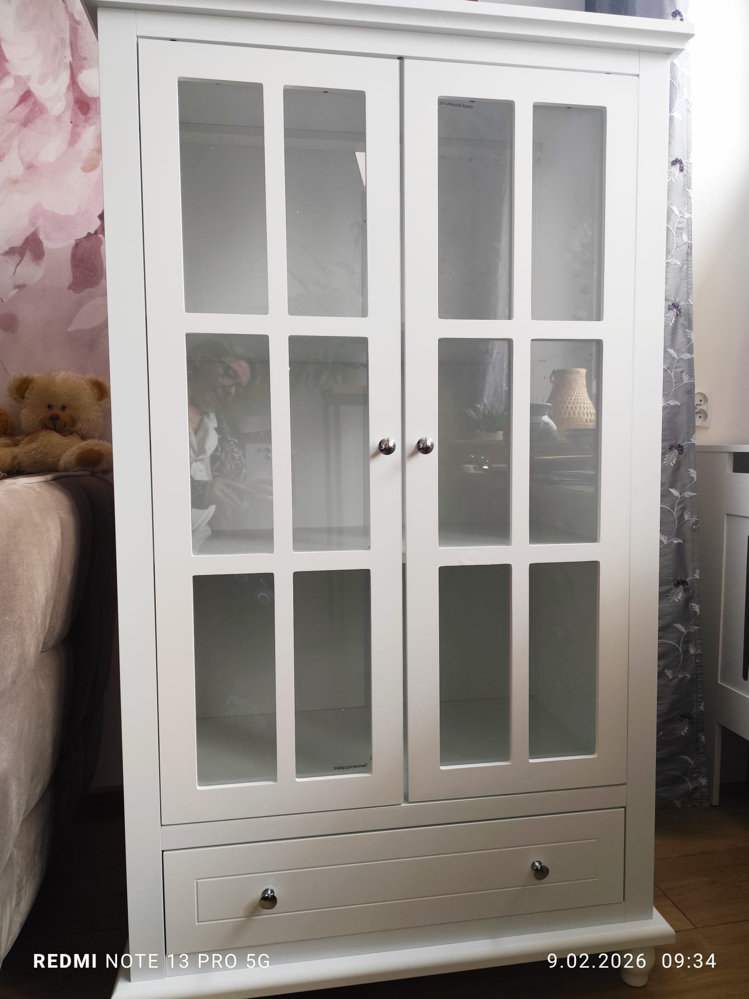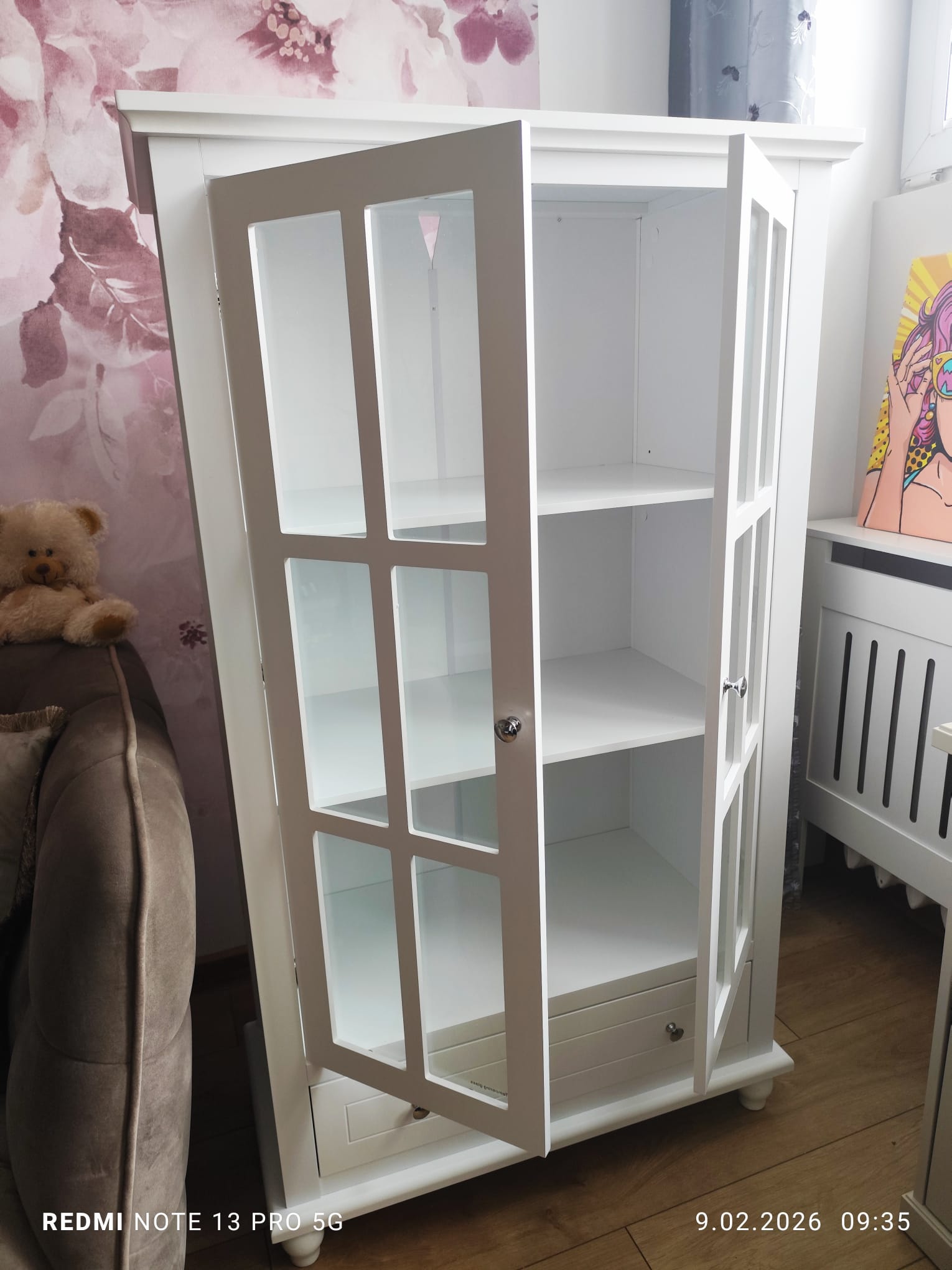 Sprzedam nową witrynę w kolorze białym z przeszklonymi drzwiczkami i szufladą. Stan idealny.