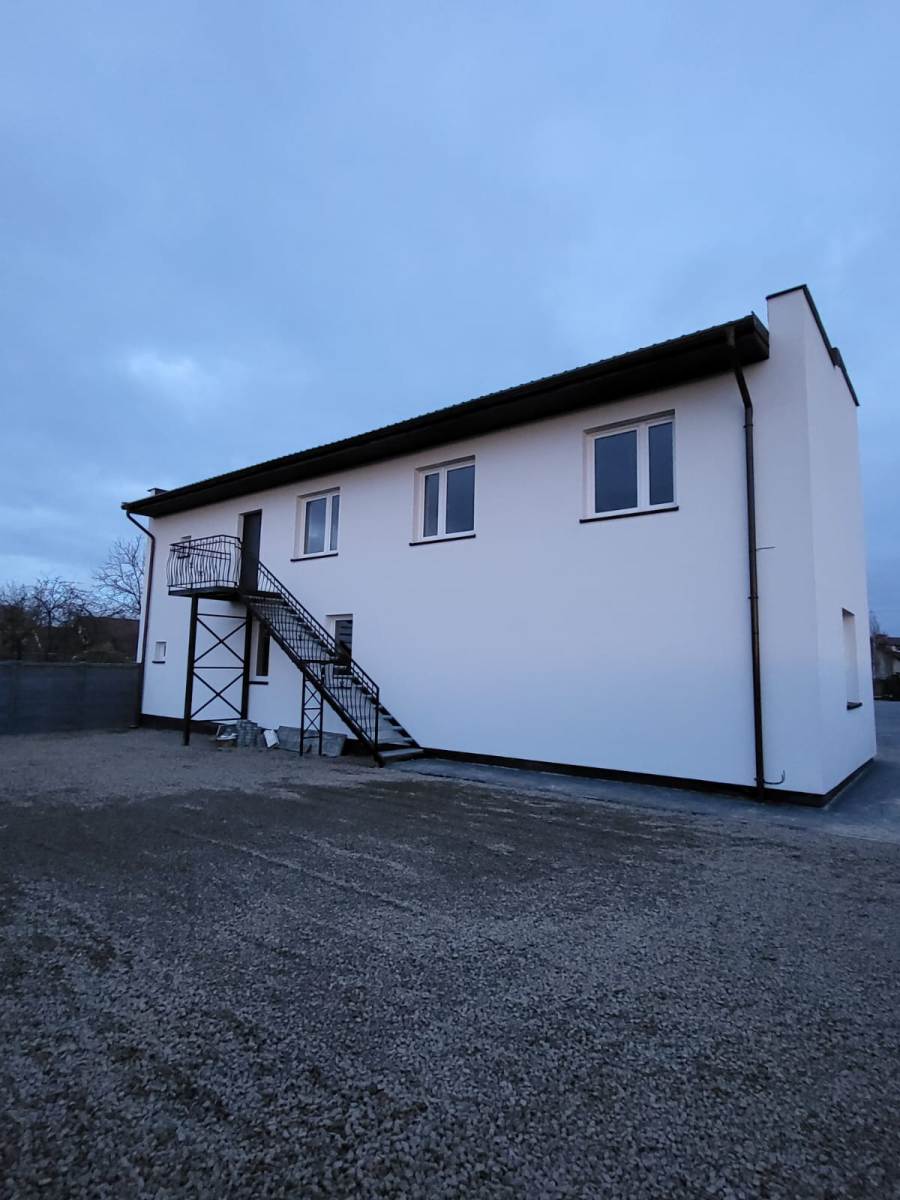 Dwukondygnacyjny budynek o powierzchni ok. 165m2 wybudowany w latach 80-tych metodą tradycyjną z cegły ocieplony 15 cm styropianem, otynkowany. Dach płaski typu stropodach, pokryty papą termozgrzewalną. Stolarka okienna PCV w kolorze białym. Stan techniczny budynku określony jako bardzo dobry, po całkowitym remoncie.
