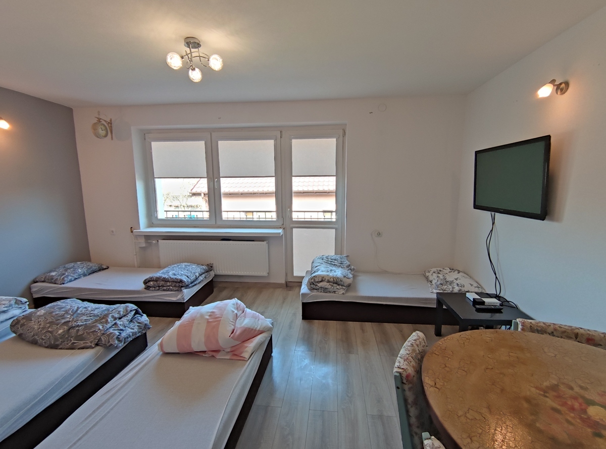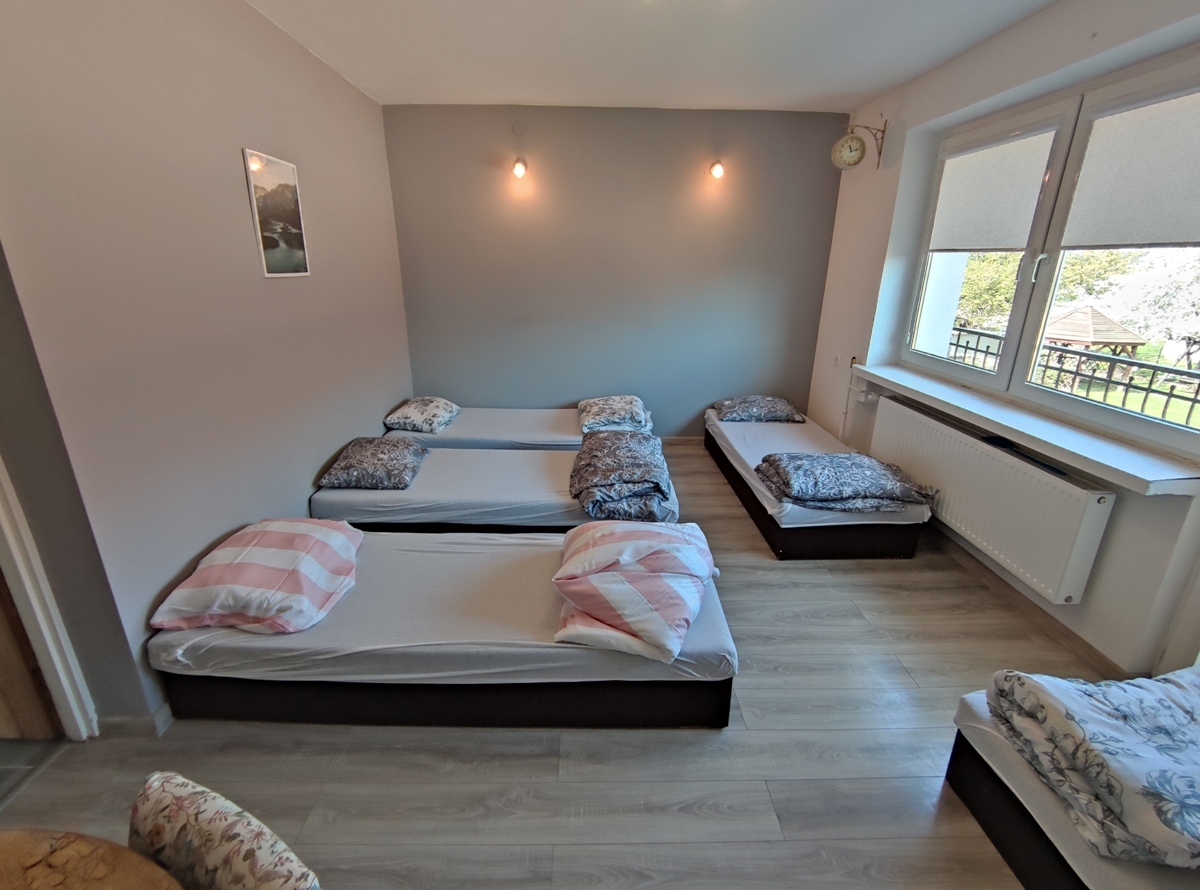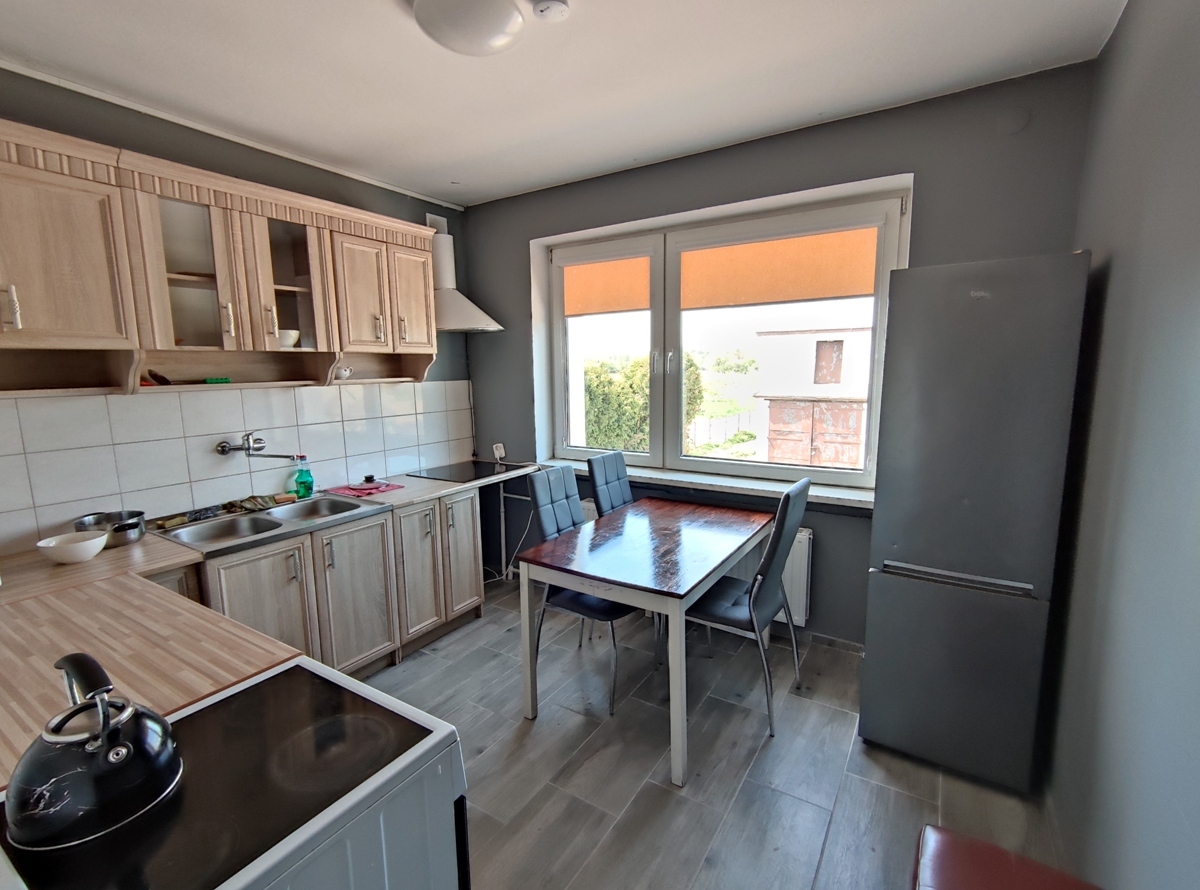 -parter: duży pokój dzienny, 2 mniejsze pokoje, kuchnia, łazienka z prysznicem, odrębne WC, przedpokój: