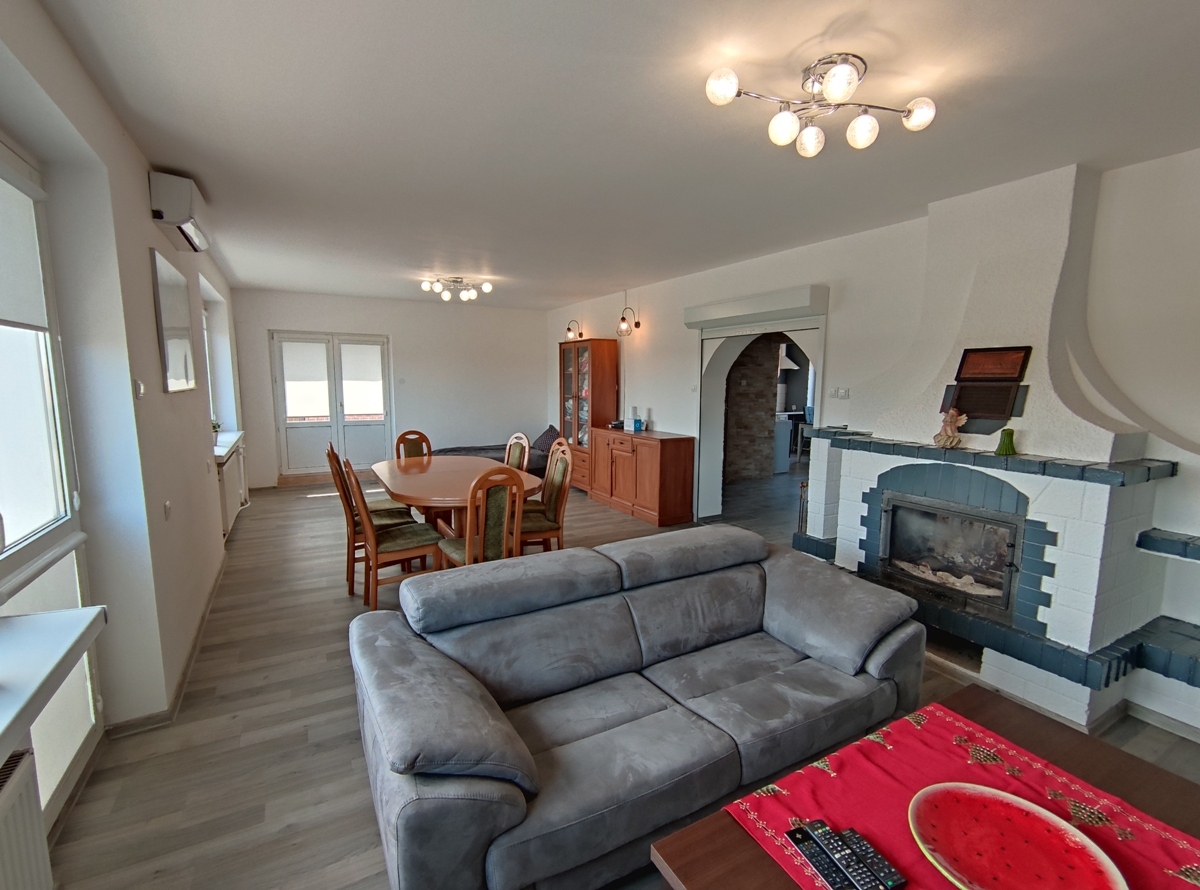-piętro: duży salon z kominkiem oraz z wyjściem na balkon, pokój (ok. 20m2) z wyjściem na balkon, przestronna kuchnia, łazienka z prysznicem i WC, klatka schodowa.