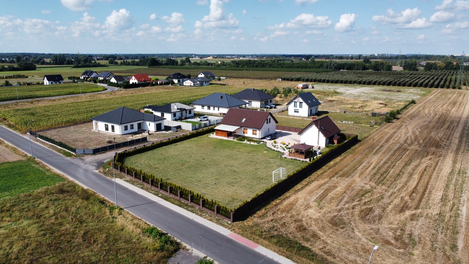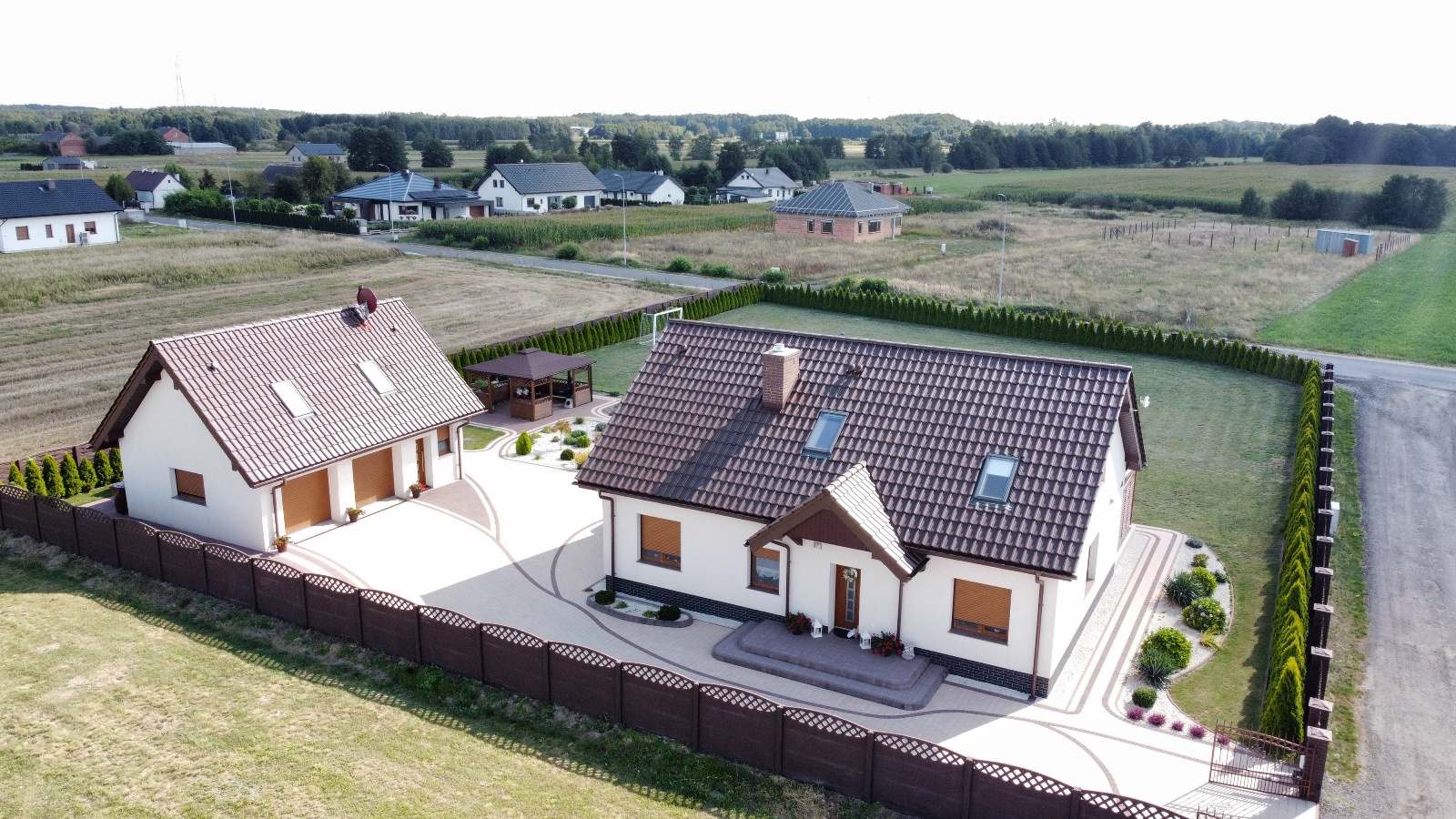 Zapraszam do zapoznania się z ofertą sprzedaży nieruchomości gruntowej zabudowanej, zlokalizowanej w miejscowości Janowice przy ul. Brylantowej w gminie Stare Miasto, w odległości około 9 km (15 minut samochodem) od centrum Konina. Działka o powierzchni 2385 m2, na której posadowiony jest nowoczesny, wolnostojący, parterowy z poddaszem użytkowym budynek mieszkalny o powierzchni użytkowej 152.66 m2 oraz budynek gospodarczo-garażowy z lokalem mieszkalnym na poddaszu o łącznej powierzchni użytkowej tego budynku 72 m2. Budynek mieszkalny oddany do użytku w 2020 roku, budowany w technologii tradycyjnej. Wnętrze domu stanowią dwie kondygnacje. Na przestrzeni parteru znajdują się: wiatrołap 4.45m2, hall 8.70m2, salon połączony z jadalnią 34.82m2 i wyjściem na zadaszony taras, odrębna kuchnia 11.16m2, pokój (gabinet) 7.18m2, sypialnia 10.47m2, garderoba „pod schodami” 1.7m2, łazienka 3.56m2, pralnia 4.96m2-łączna powierzchnia 87.10m2. Przestrzeń poddasza stanowią 2 pokoje po około 10m2 każdy, 1 pokój 22m2, garderoba, łazienka i hall-łączna powierzchnia użytkowa to 65.56m2. Nieruchomość uzbrojona w wodę z sieci, szambo bezodpływowe, energię elektryczną, monitoring zewnętrzny, internet oraz centralne ogrzewanie zasilane piecem na ekogroszek (kotłownia w budynku garażowo-gospodarczym). Na działce oprócz budynku mieszkalnego znajduje się również wolnostojący budynek gospodarczo-garażowy z lokalem mieszkalnym typu „kawalerka” na poziomie poddasza. Działka w całości ogrodzona od frontu ogrodzenie murowane z wypełnieniem z profili metalowych, kutych. Brama wjazdowa dwuskrzydłowa automatyczna, uchylna. Bramy garażowe panelowe, automatyczne, na pilota. Działka w znacznej części (ok. 300m2) została utwardzona wysokiej jakości kostką brukową, z fantazyjnym, łukowym wzorem, w szczególności wejście do domu, podjazd do i przy garażu, przejście wokół budynku, teren na którym posadowiona jest altana ogrodowa.