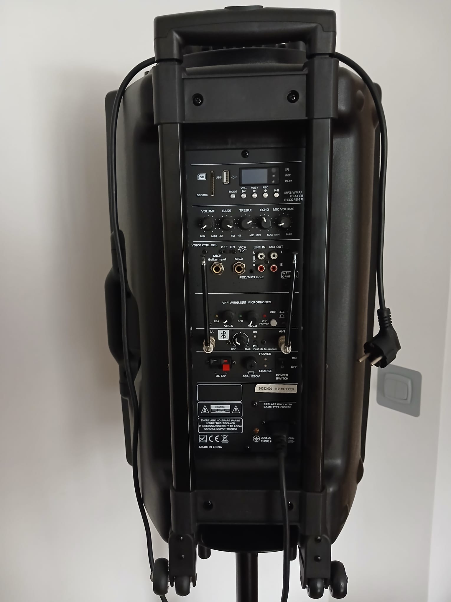 Funkcje głośnika: odtwarzacz plików MP3/WMA, funkcja REC, funkcja VOX, kontrola poziomu głośności, wejścia mikrofonowe i liniowe, regulacja tonów niskich i wysokich, wbudowany akumulator wielokrotnego ładowania, kontrola nad poziomem głośności i funkcją echa w mikrofonie, zasilanie 220-240V / 50-60Hz (możliwość zasilania 12V lub z wbudowanej baterii).