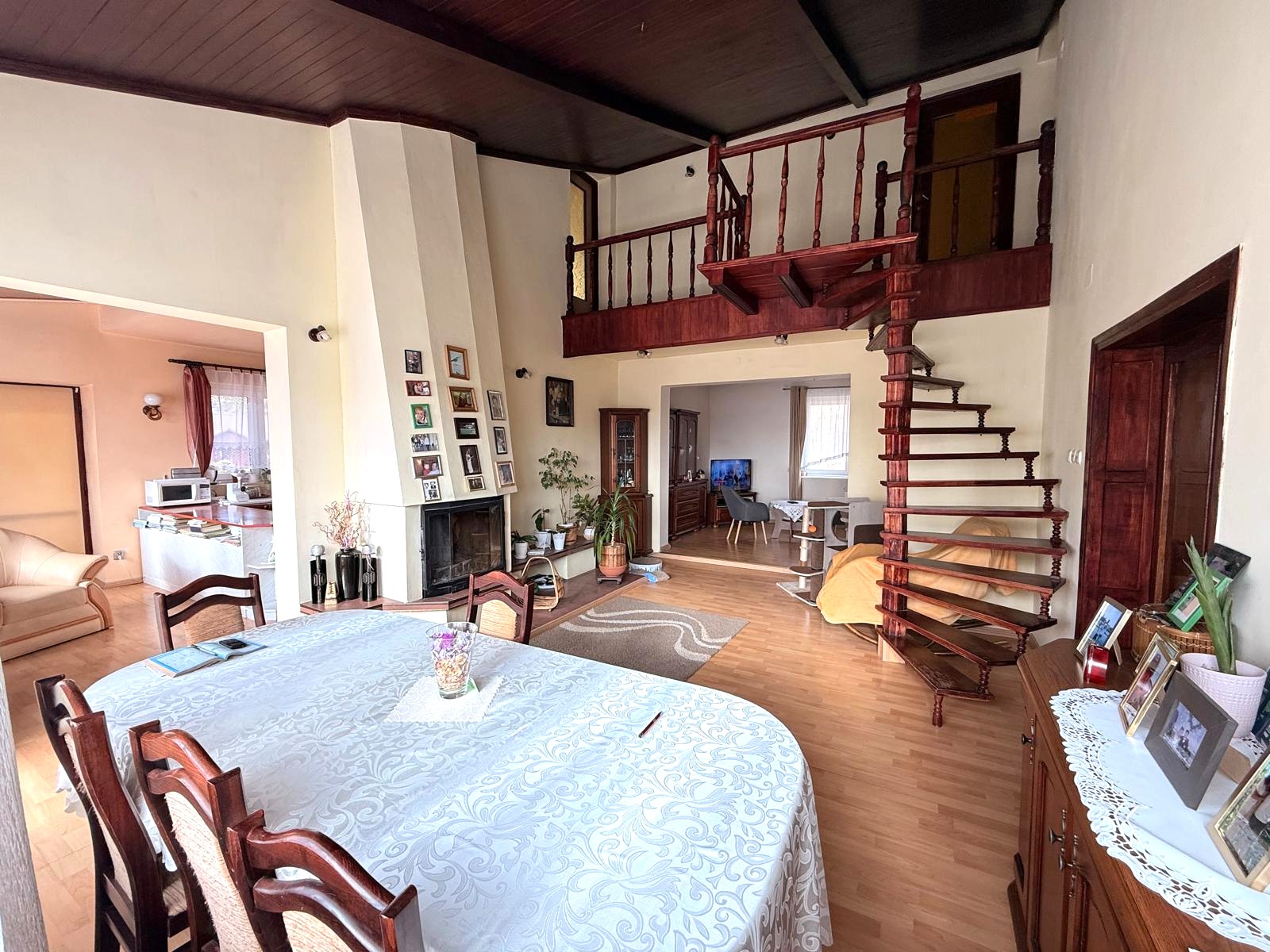 KLIMAT: Salon z wysokim sufitem (antresola!) i kominkiem