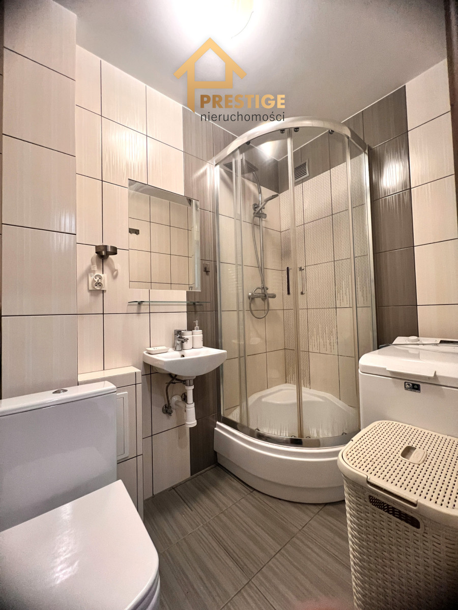 Łazienka w pełni wyposażona z prysznicem i pralką.