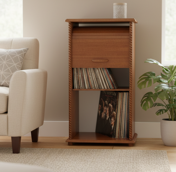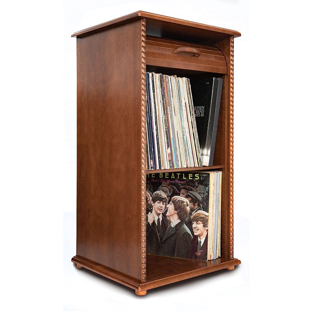 Posiada ona roletę zabezpieczającą przed kurzem - wszystkie płyty są więc schowane. Odległość między półkami wynosi 33 cm. Do szafki możesz włożyć większe i mniejsze płyty winylowe, a na górny wieniec gramofon, dzięki czemu wszystko masz w jednym miejscu. Regał pomieści też dokumenty w formacie A4 i mniejsze. Do wyboru są 2 opcje wysokości mebla.