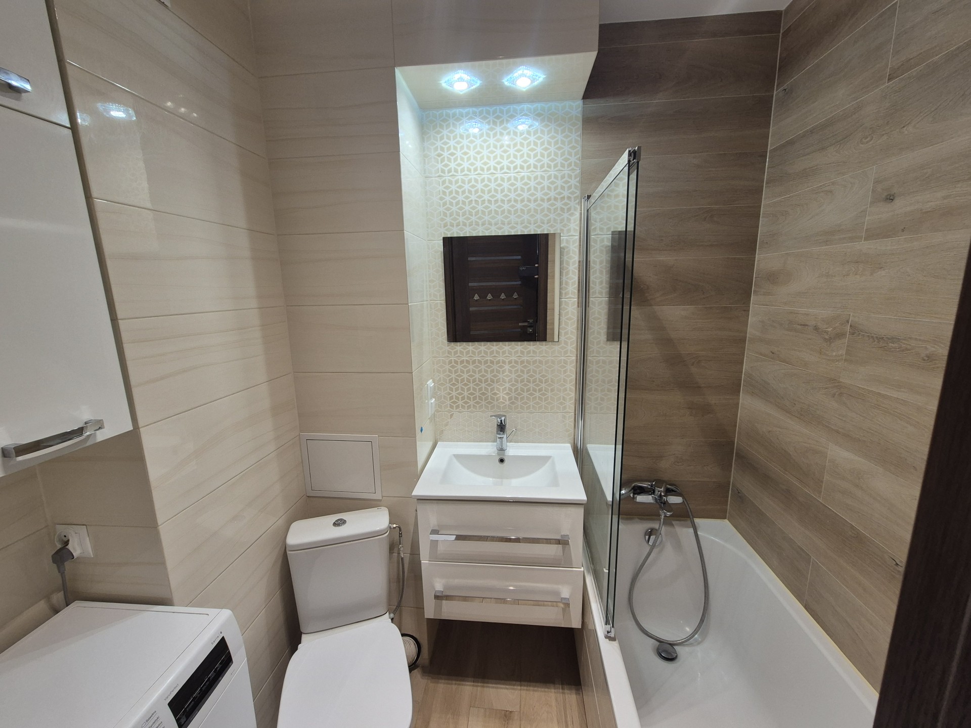 - Łazienki - wanna z szybą, umywalka, wc oraz pralka
