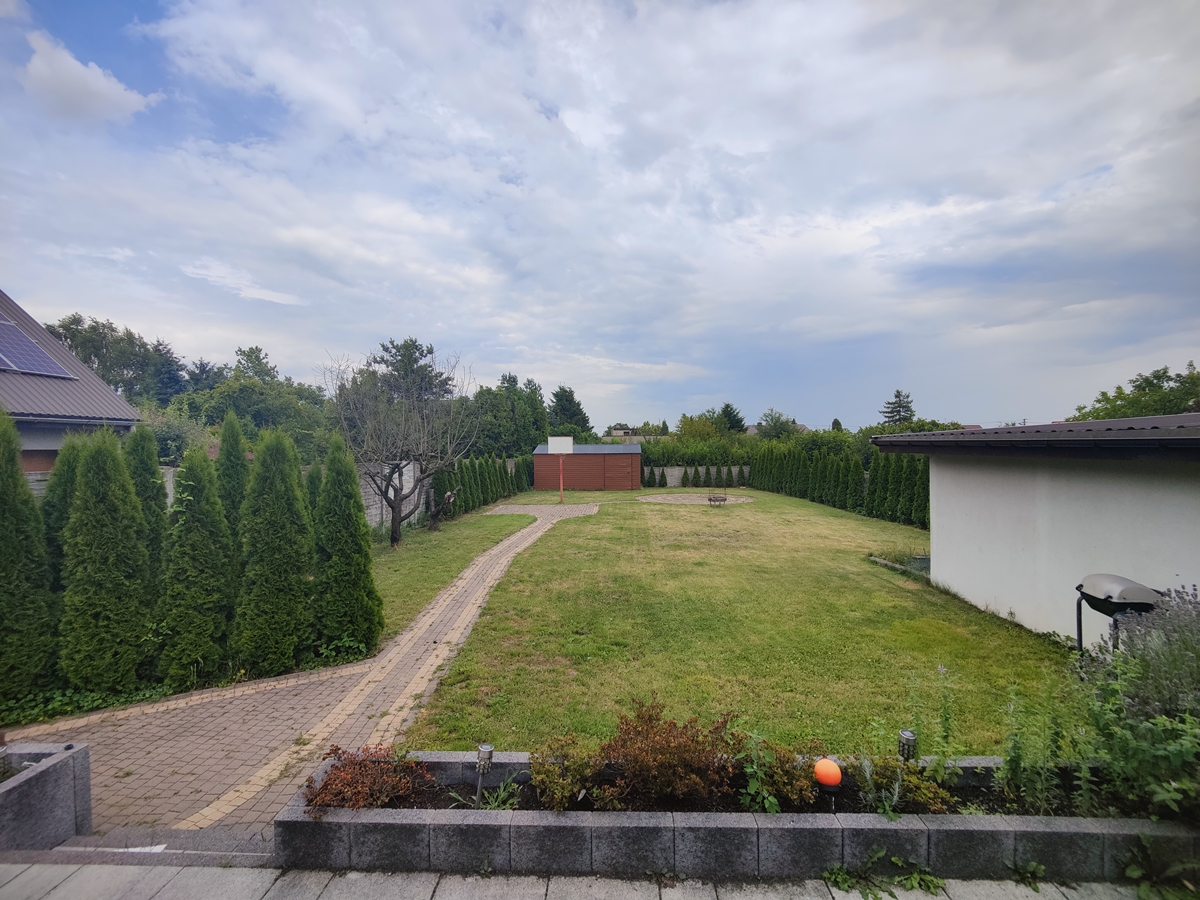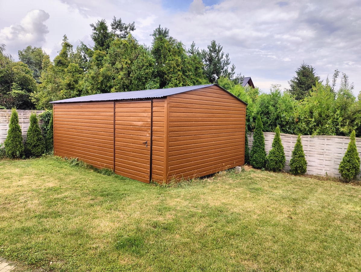 Do domu dobudowany długi garaż na 3 auta parkowane jeden za drugim. Na tyłach działki dodatkowo garaż blaszany.