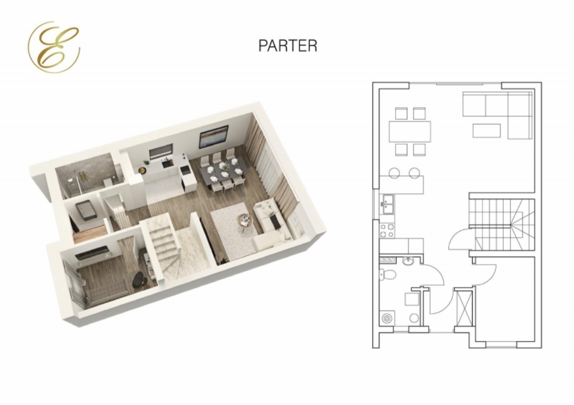 - parter – salon z aneksem kuchennym, gabinet, łazienka, wiatrołap, klatka schodowa