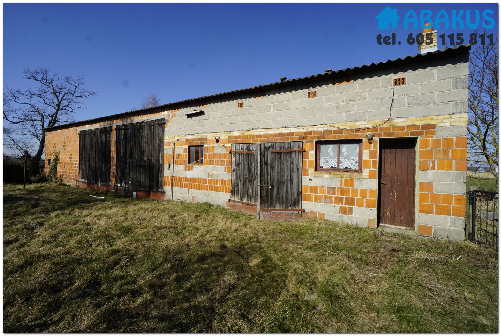 - budynek gospodarczo-garażowy o pow. 100 m2 murowany składający się 3 garaży oraz pomieszczenia inwentarskiego, dach jednospadowy kryty eternitem, posadzki betonowe, tynki cementowo-wapienne.