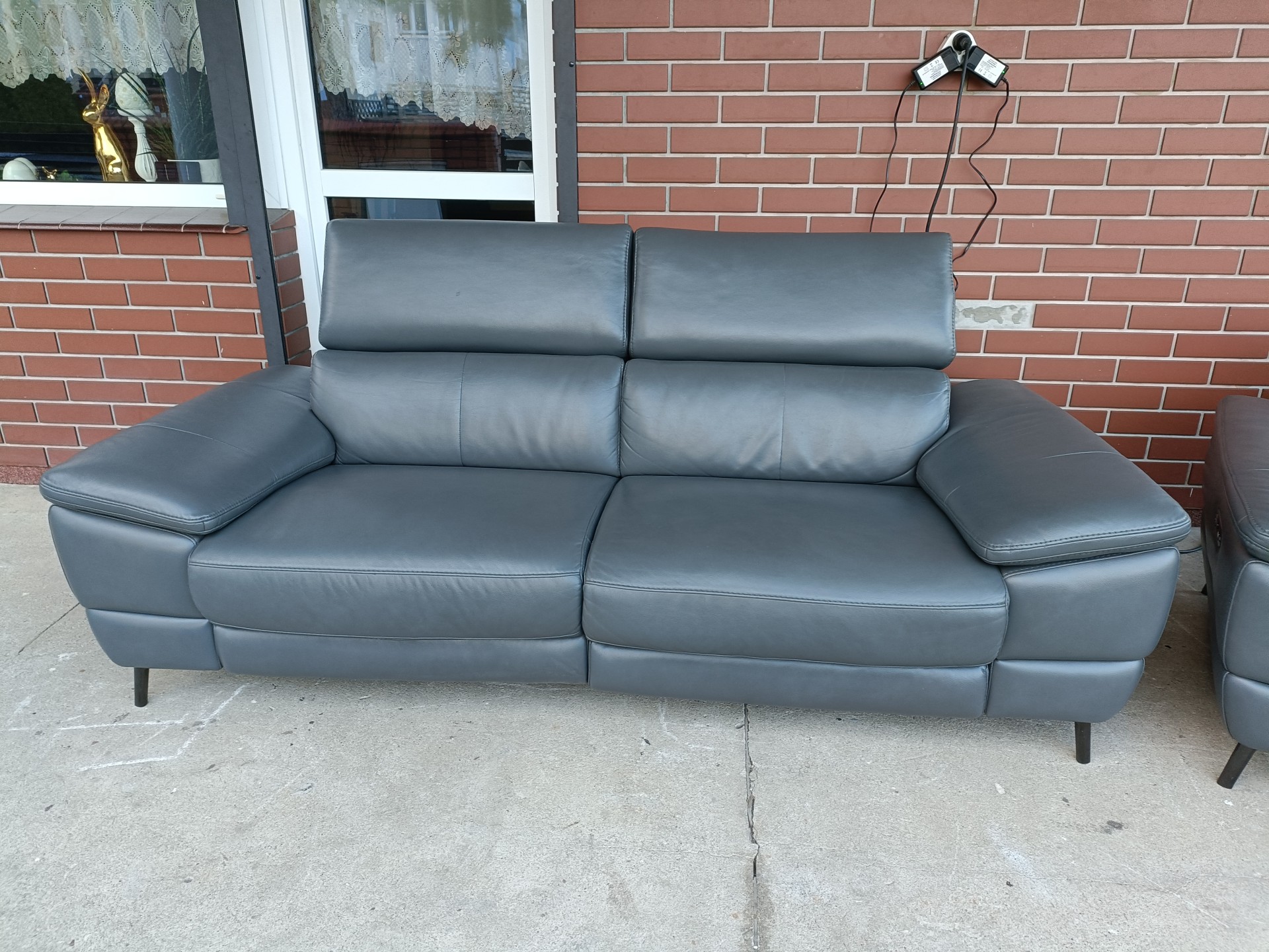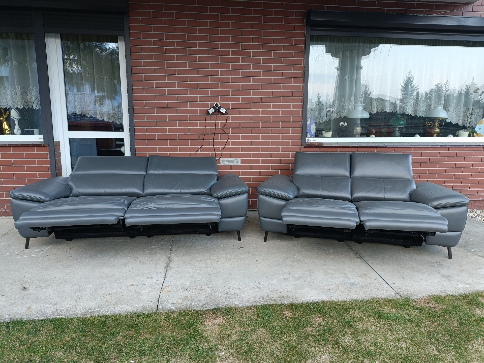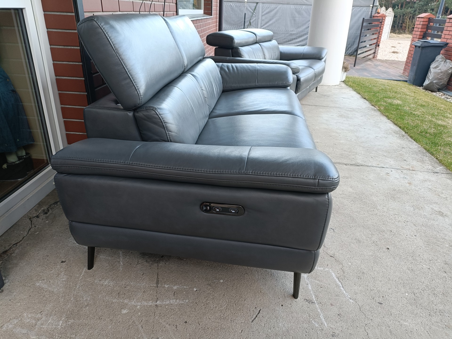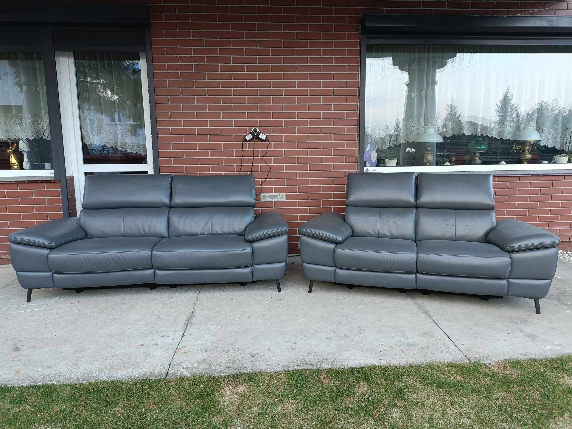 Sprzedam dwie sofy ze skóry 2,3 osobowa kolor ciemny popiel wymiary sofa 2 osobowa 1,80 sofa 3 osobowa 2,10 sofy poosiadają elektryczną funkcję relaks i regulowane zagłówki