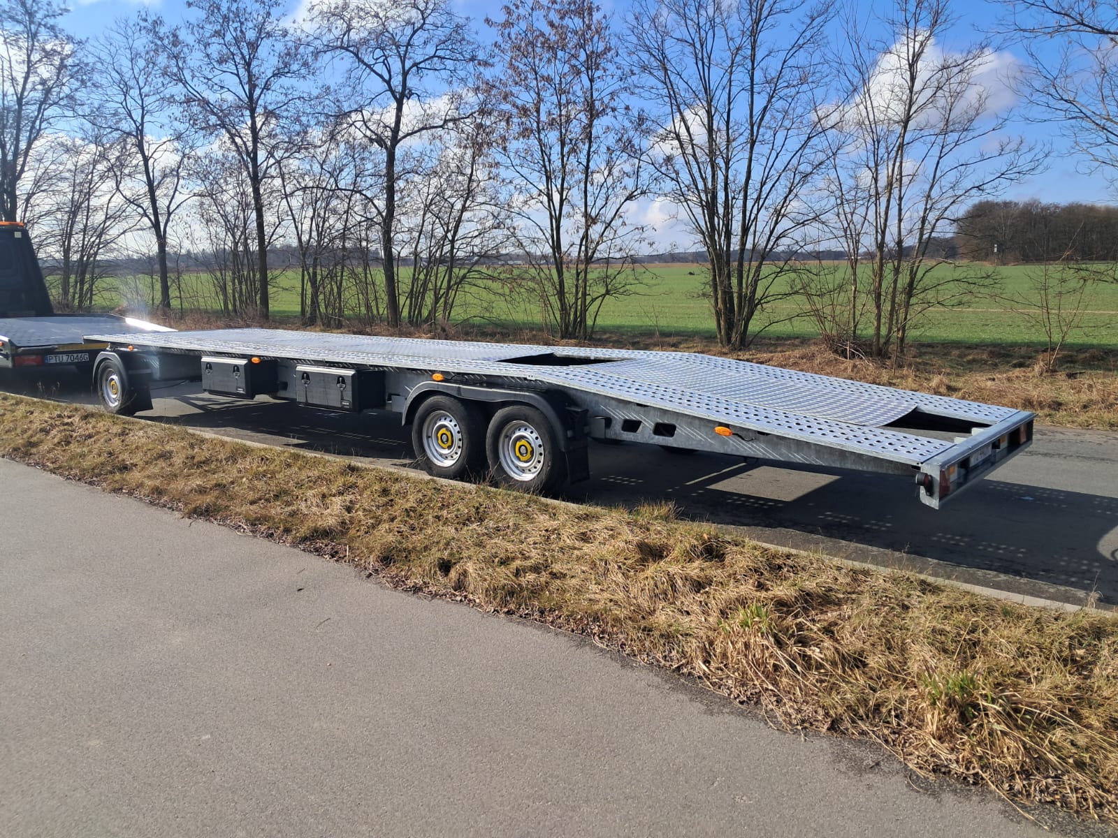 Sprzedam lawetę obrotnicę firmy ,, WEEKEND '' , rok produkcji 12. 2023 , pierwsza rejestracja styczeń 2024, 1 właścieiel , ładowność 2280 kg ,laweta posiada 4 skrzynki do pasów ,naprawy na bieżąco , osie 1500 kg Knott , przegląd 01.2027 , OC do 2027 , kupujący zwolniony z opłaty skarbowej , cena 35 900 zł, tel. 530 709 673