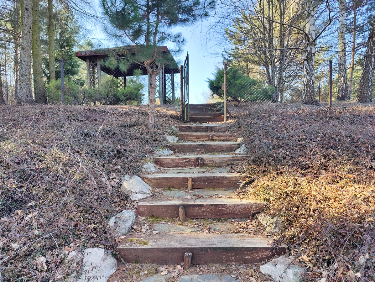 Działka o powierzchni 1465 m2, zagospodarowana częściowo trawnikiem i nasadzeniami ozdobnymi oraz drzewami owocowymi, ogrodzona siatką otuloną żywopłotem z tui.