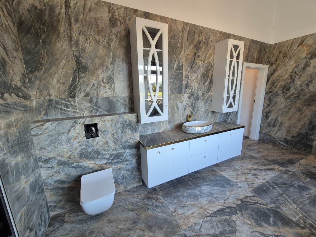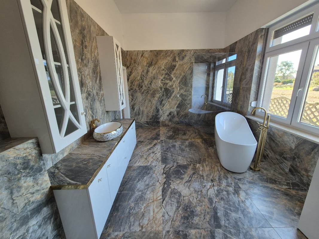 - ściany: gładź szpachlowa, glazura, lamele ścienne w kolorze złota, designerska tapeta dekoracyjna;