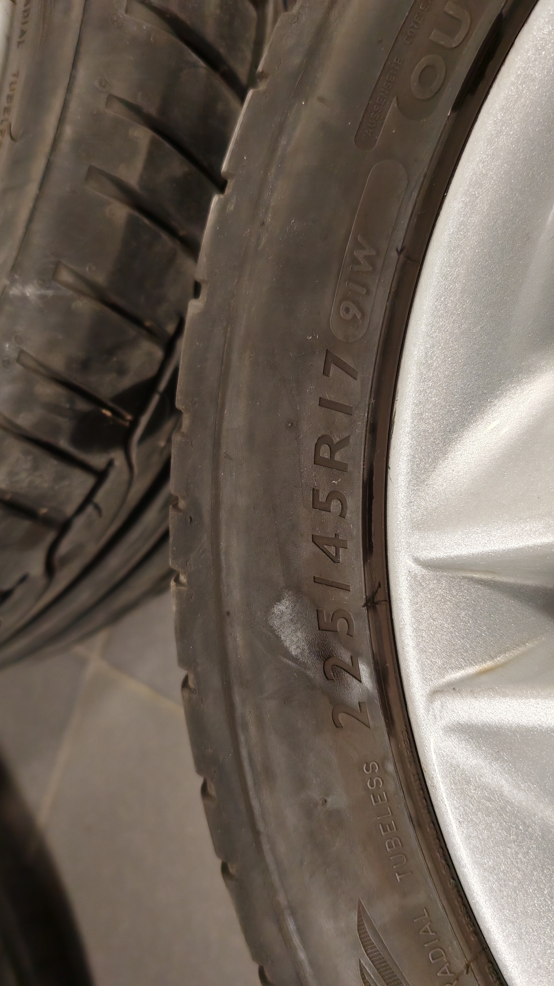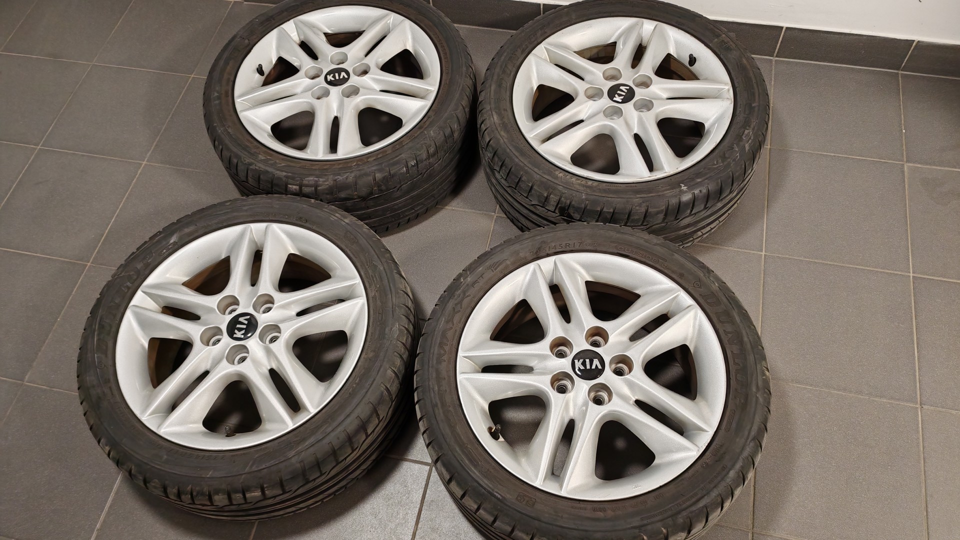 Sprzedam felgi aluminiowe z oponami Kia. Opony Dunlop 225/45 r 17. Jedna opona uszkodzona-dziura. Opony 2x 2021r 2 x 2019r. Cena 1300