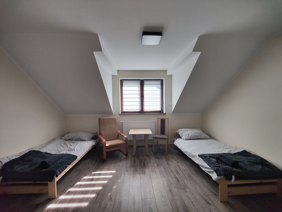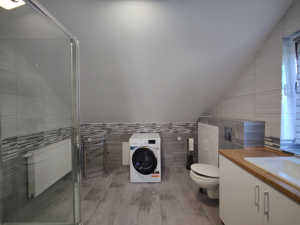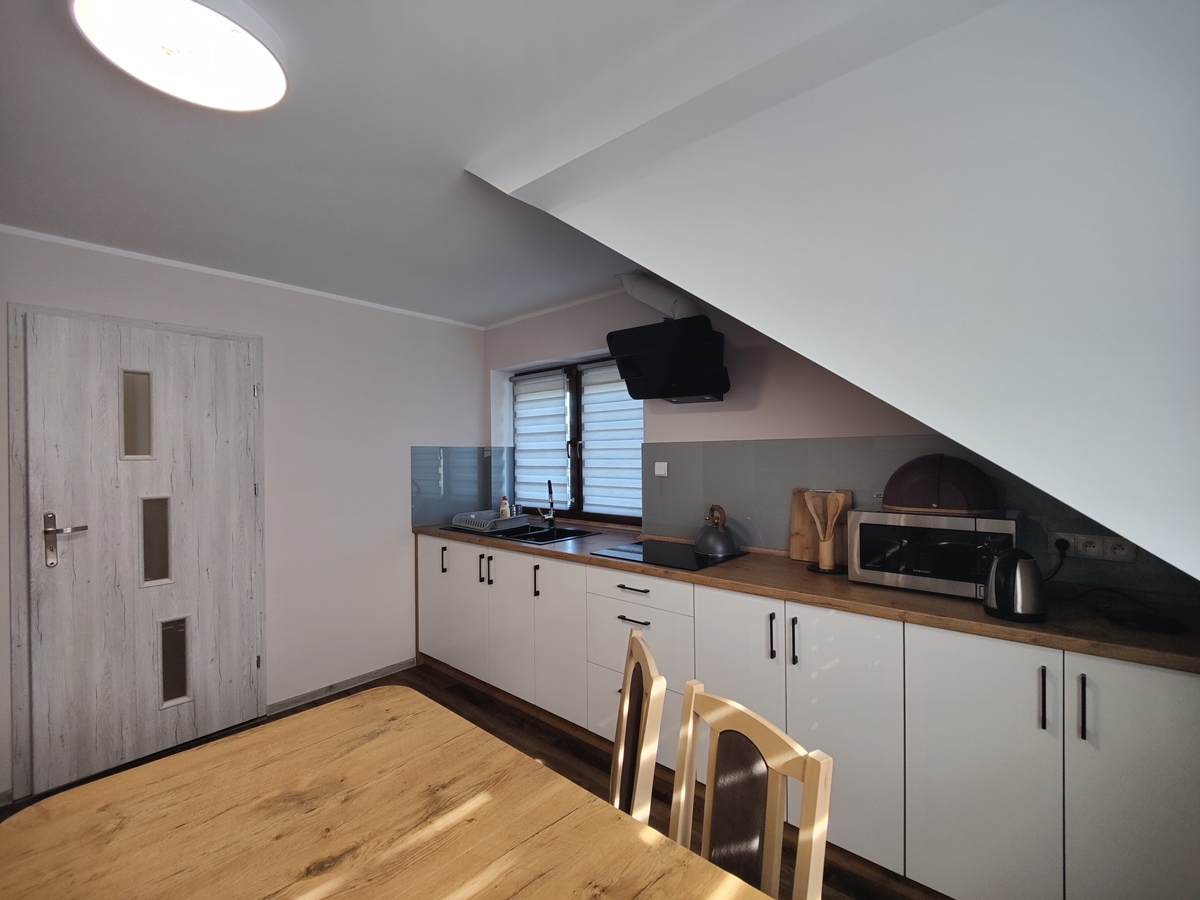 Na poddaszu podłogi wyłożone panelami i terakotą. Nowe drzwi wewnętrzne. W kuchni zabudowa kuchenna wraz z sprzętem AGD (lodówka, piekarnik i mikrofala w zabudowie, płyta grzewcza indukcyjna, okap). Każdy pokój wyposażony w dwa łóżka, szafę, komodę, TV, fotel i stolik kawowy. W przedpokoju szafa. W łazience pralka i szafka pod umywalką.