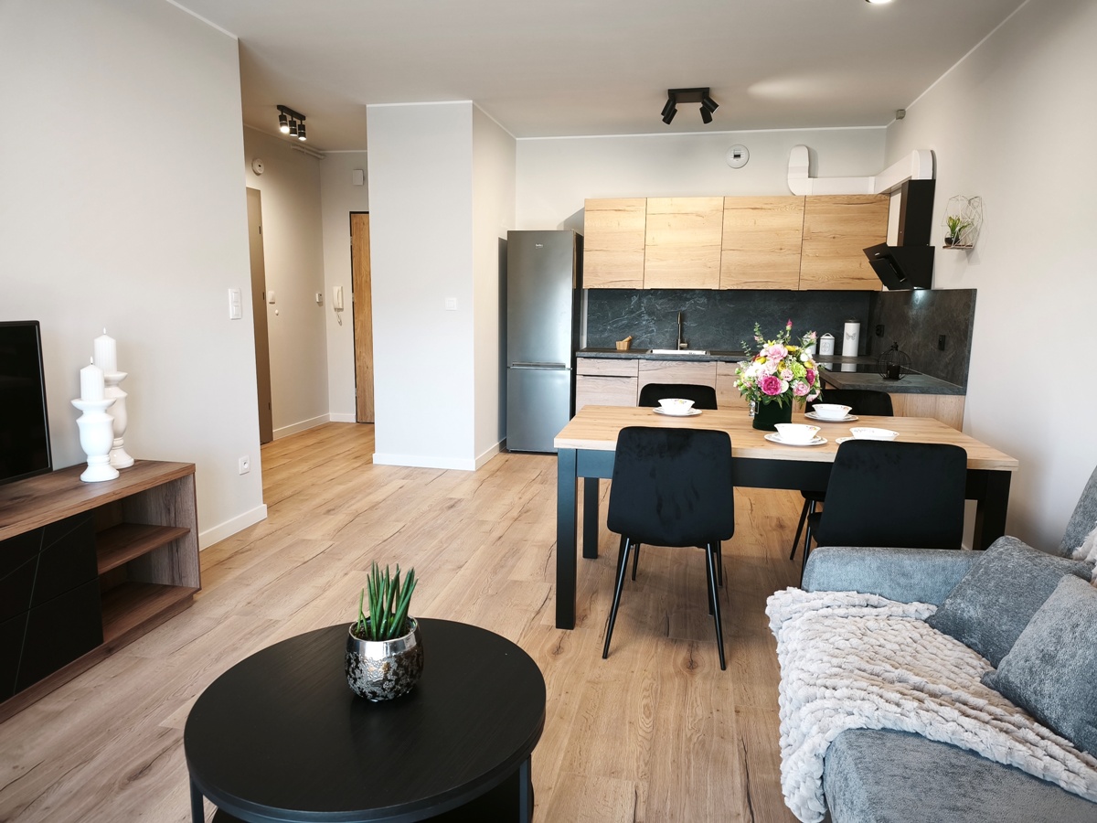 -Pokój dzienny z wyjściem na balkon i aneksem kuchennym: kanapa z funkcją spania, stolik kawowy, stół, 4 krzesła, regał stojący, szafka RTV, telewizor, nowoczesna zabudowa kuchenna wraz ze sprzętem AGD typu płyta indukcyjna, piekarnik, zmywarka, pochłaniacz pary, lodówka wolnostojąca.