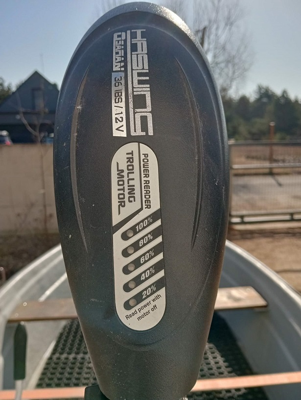Z silnikiem elektrycznym (Haswing 36185/12V) 5 biegów do przodu i 3 do tyłu, z akumulatorem żelowym ( Toyama NPG80-12 12V80Ah). W zestawie kompletna echosonda GERMIN STRIKER 5 (torba na echosondę, akumulator żelowy, ładowarka, komplet mocowań, przetwornik GERMIN z uchwytem i mocowaniem, dokumentacja>