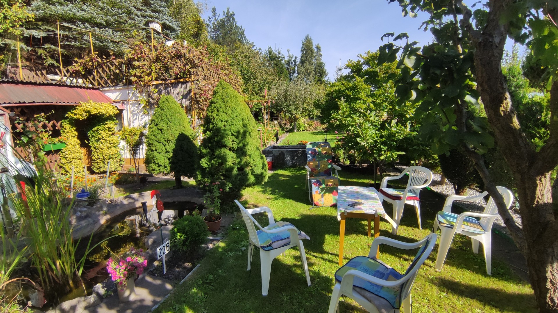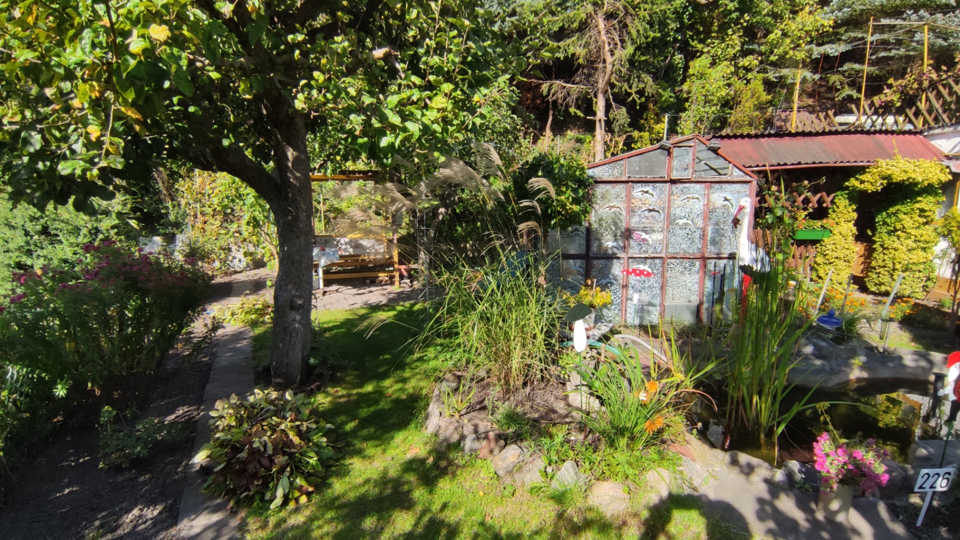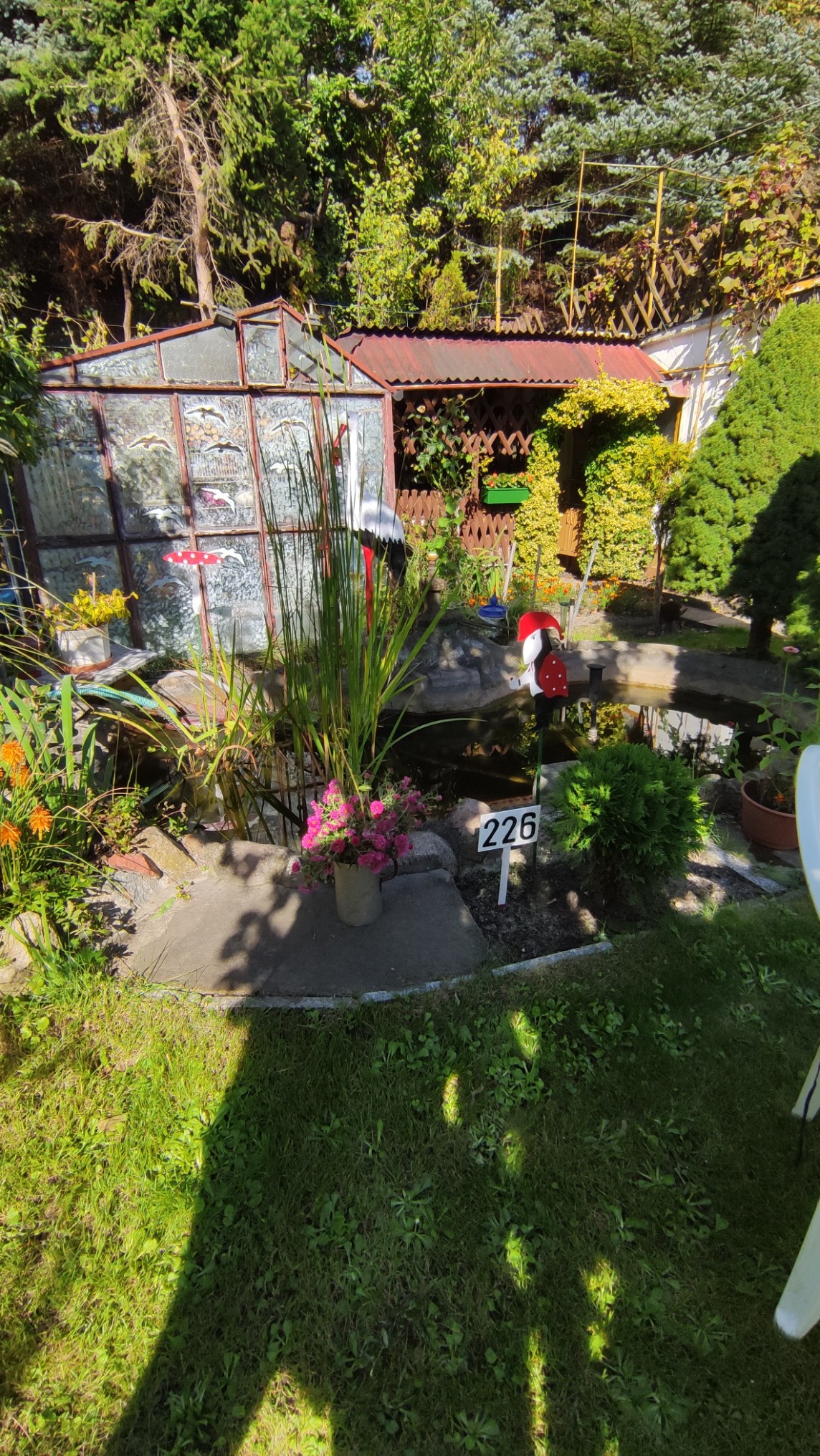 Na działce zadbany trawnik z oczkiem wodnym oraz fontanną a także szklarnia z metalowym stelażem na szyby.
