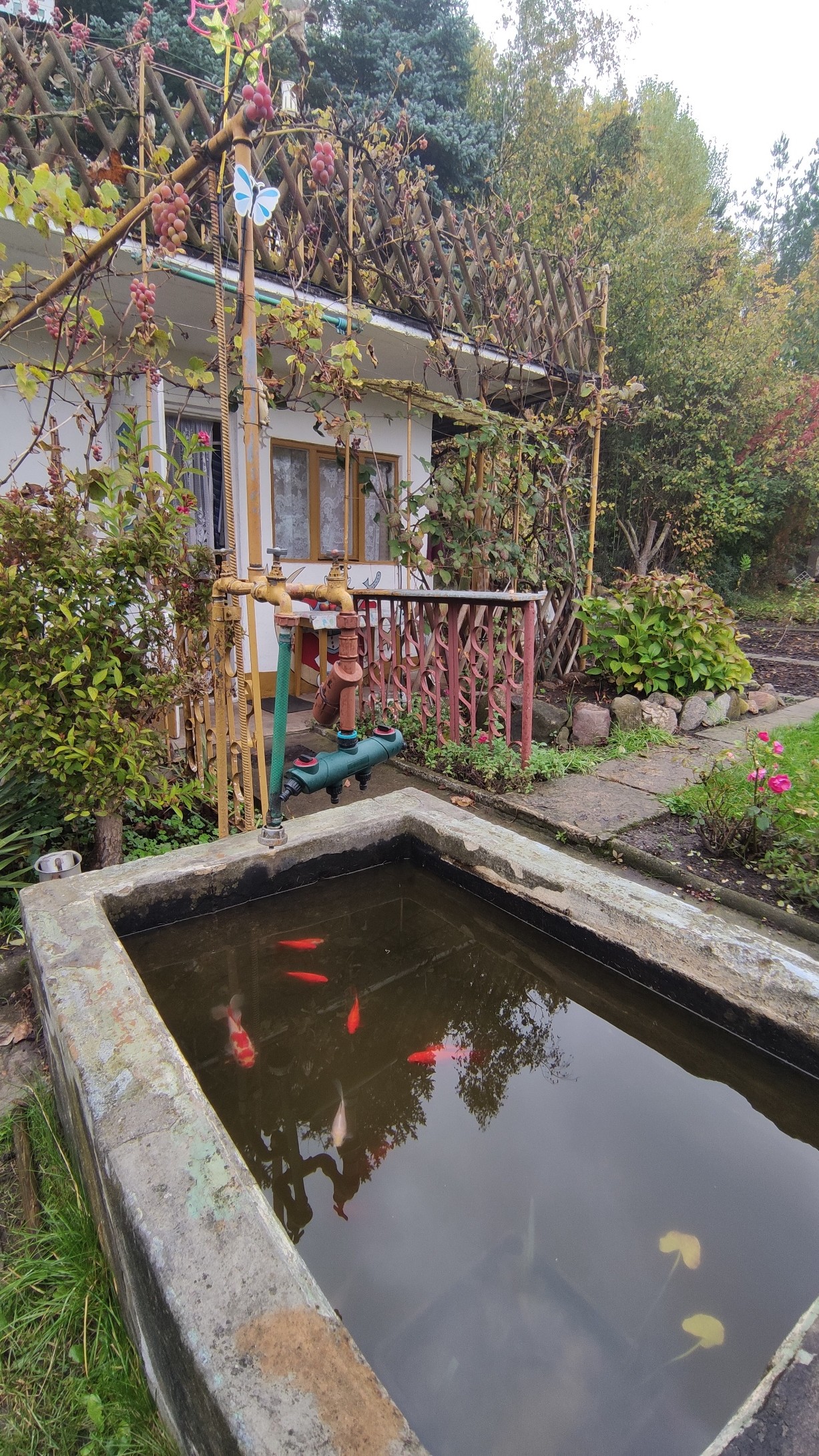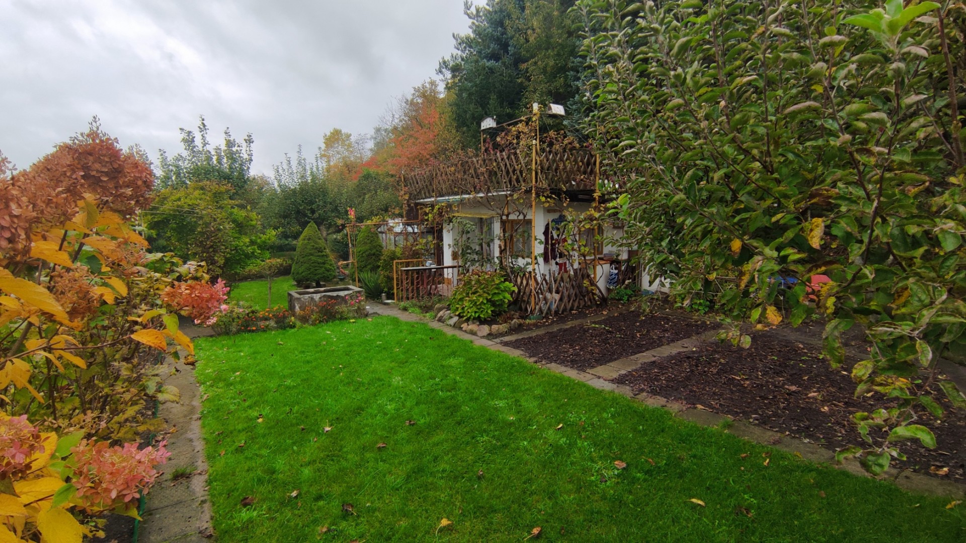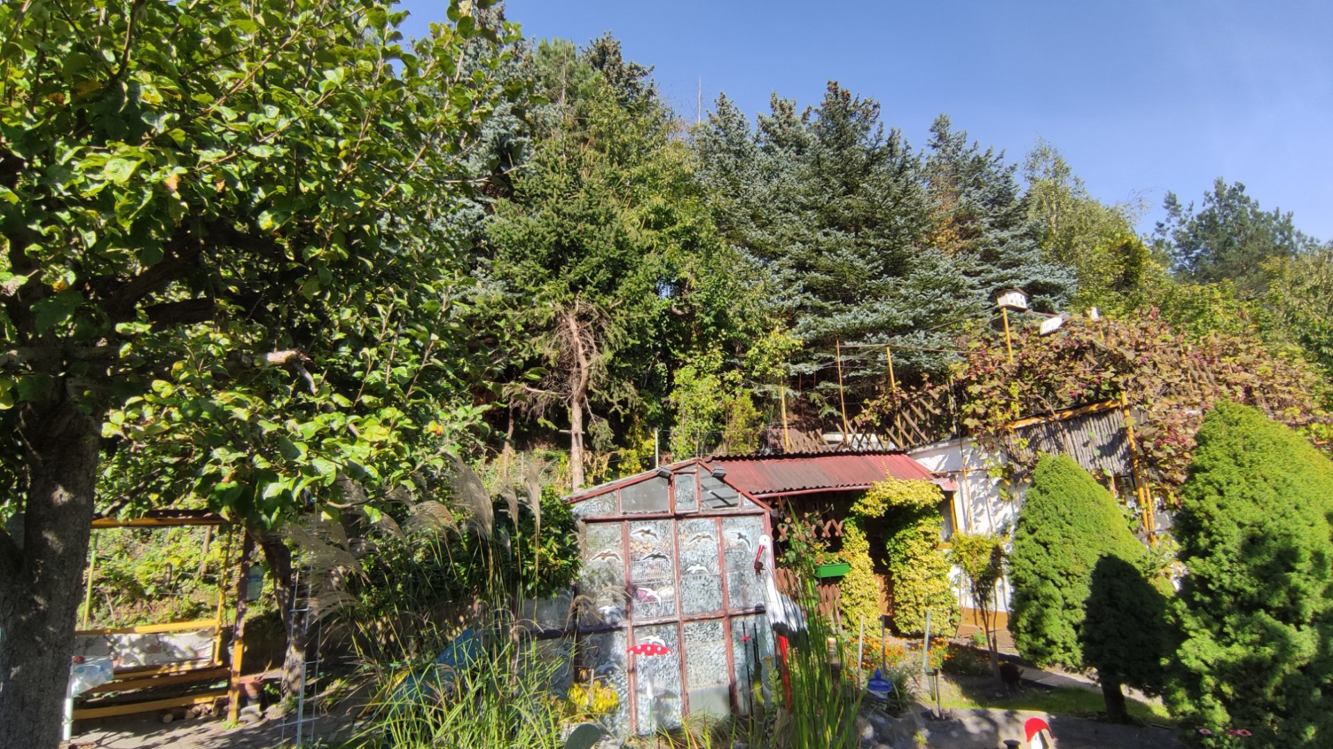 Na działce zadbany trawnik z oczkiem wodnym oraz fontanną a także szklarnia z metalowym stelażem na szyby.