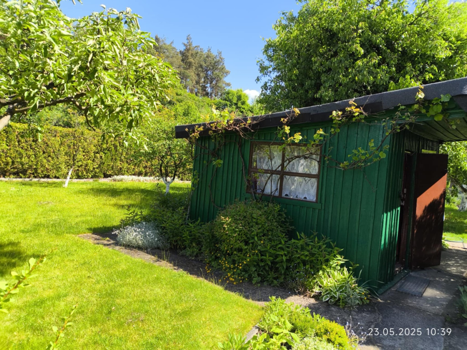 Na działce znajduje się drewniana altana oraz murowany składzik na narzędzia, co zapewnia wygodne miejsce do przechowywania sprzętu ogrodowego.