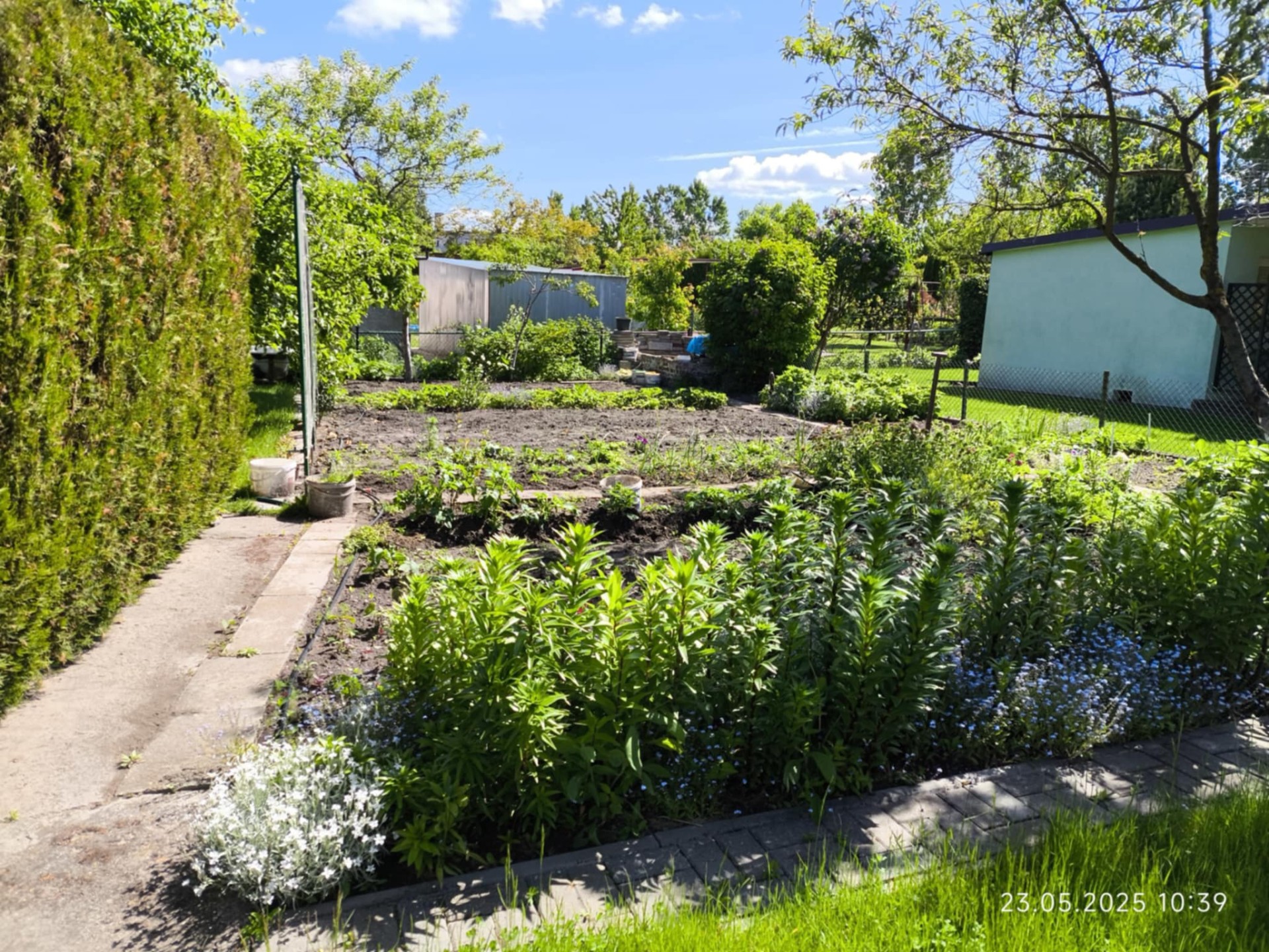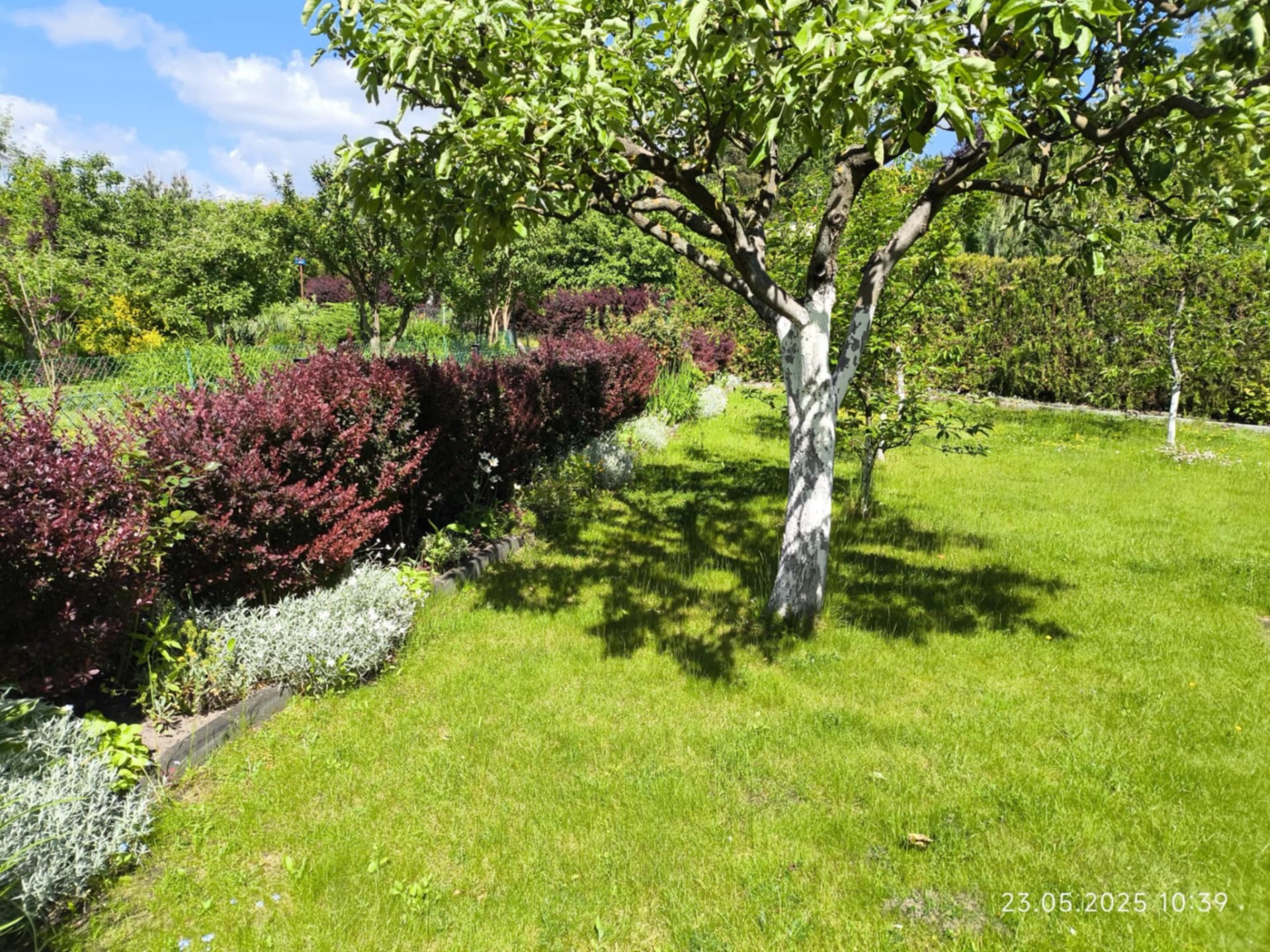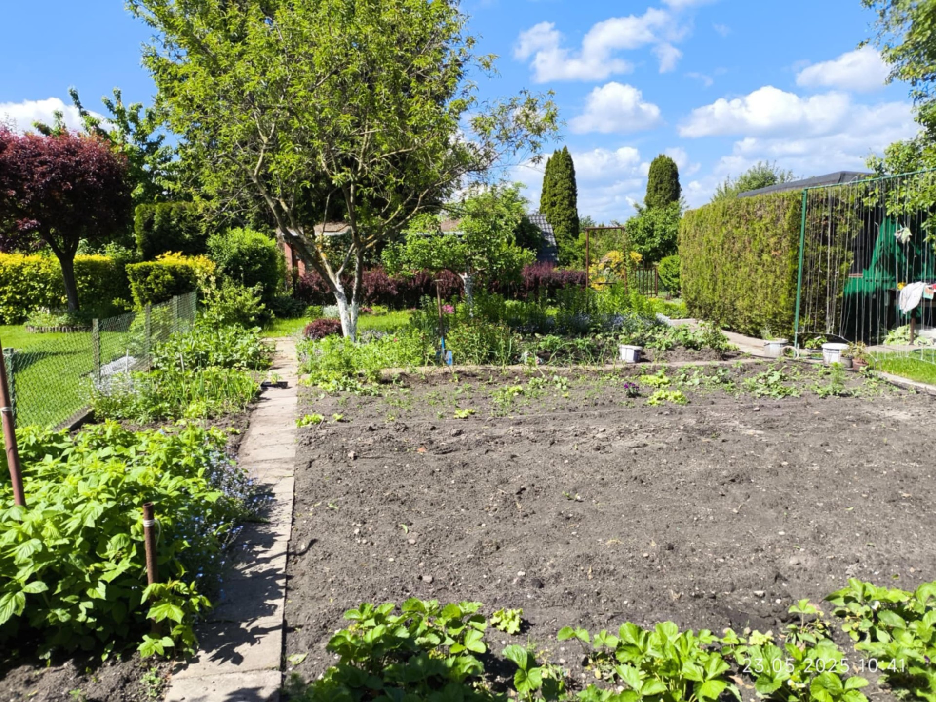 Teren jest funkcjonalnie zagospodarowany: około połowa działki przeznaczona jest pod uprawę warzyw (w rogu działki znajduje się murowany, podwójny kompostownik), druga część to trawnik z drzewkami (papierówka, malinówka, wiśnie, brzoskwinia) i krzewami owocowymi (czerwona porzeczka, maliny, agrest) po boku. Na działce znajdują się także liczne nasadzenia ozdobne, które dodają działce uroku w porze wiosenno-letniej.