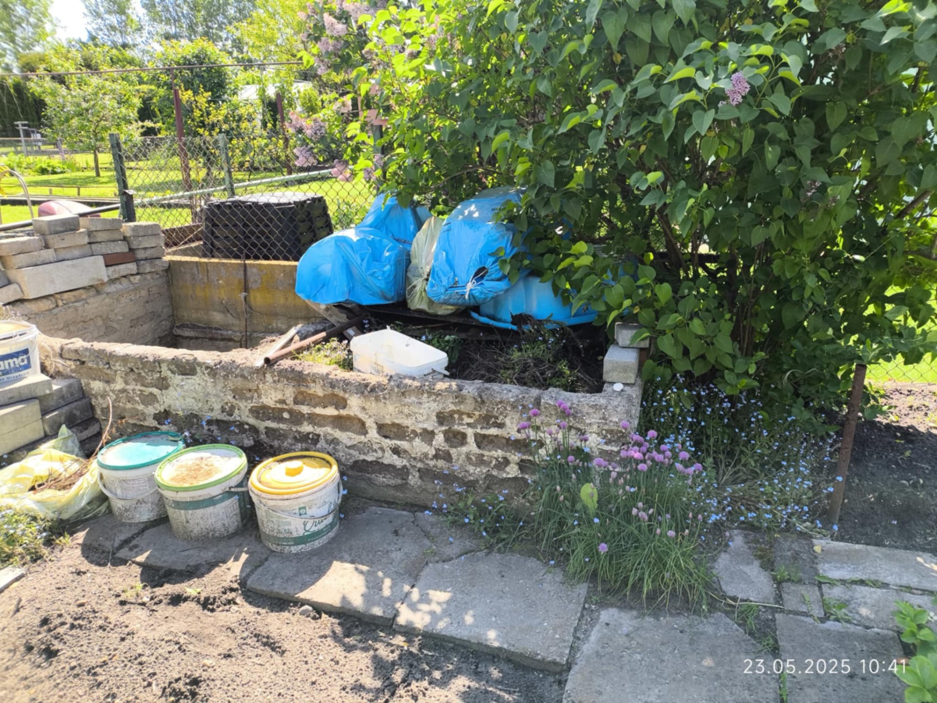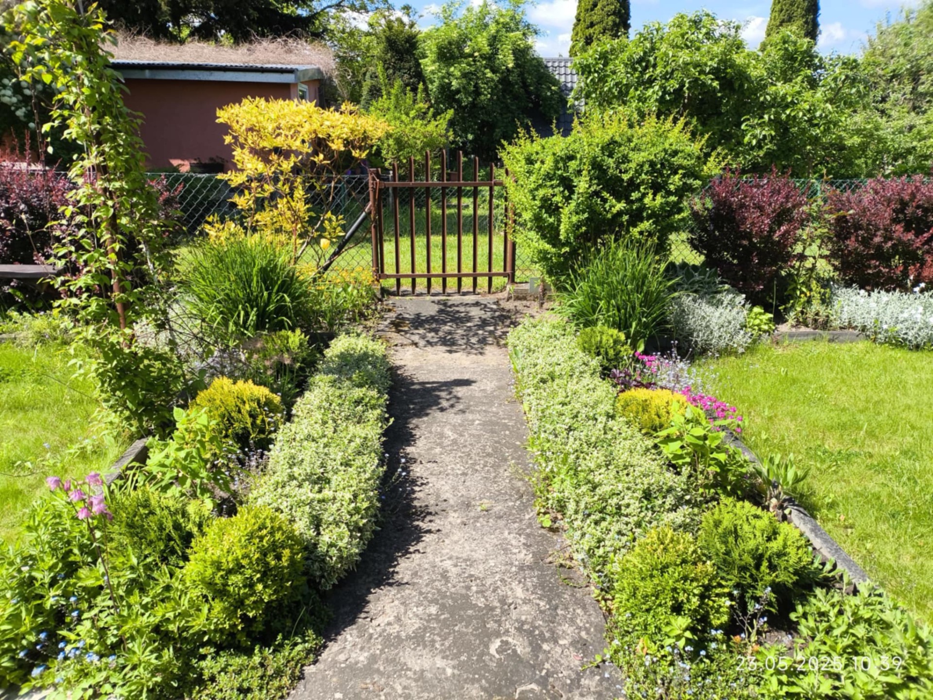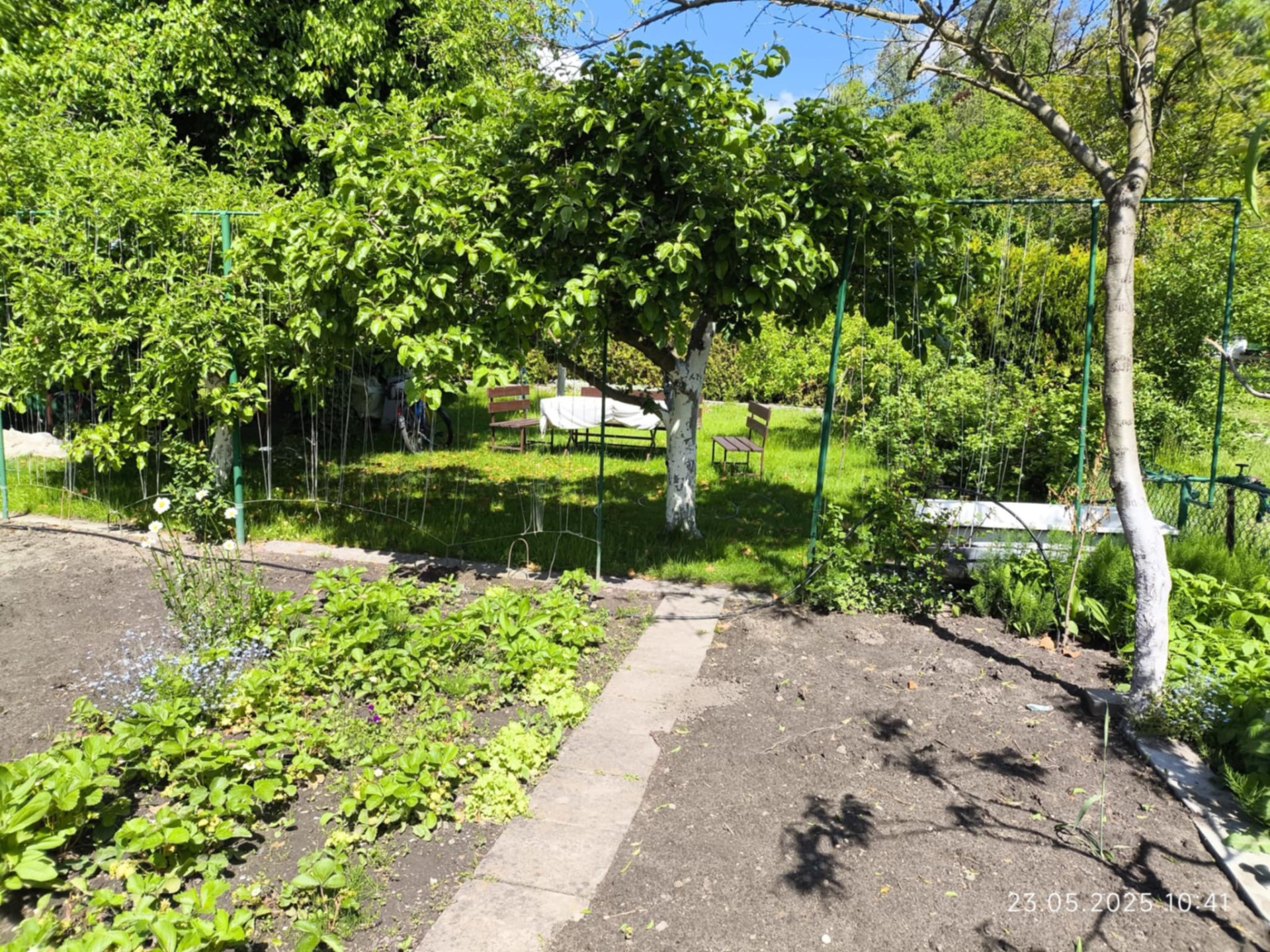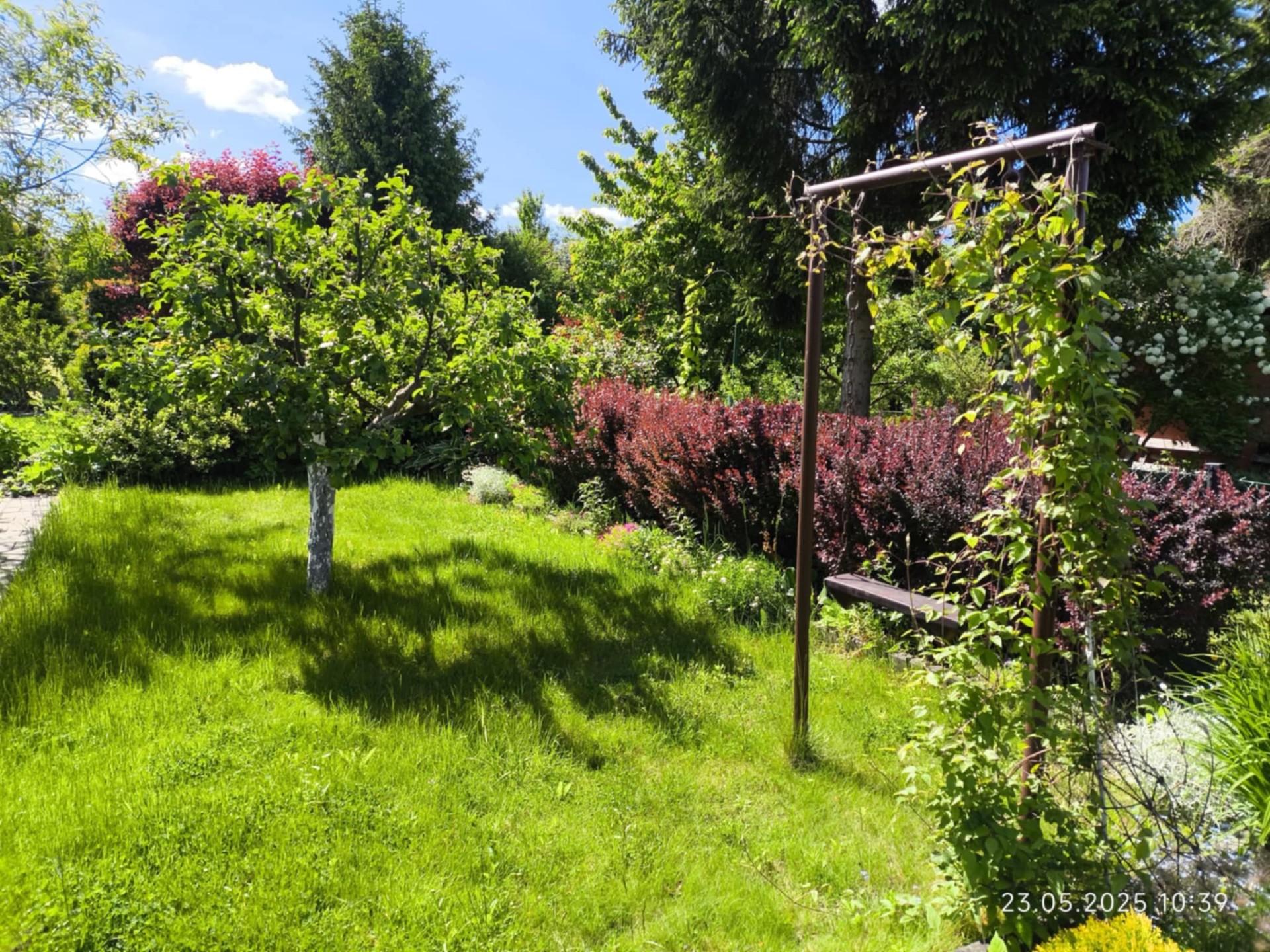 Teren jest funkcjonalnie zagospodarowany: około połowa działki przeznaczona jest pod uprawę warzyw (w rogu działki znajduje się murowany, podwójny kompostownik), druga część to trawnik z drzewkami (papierówka, malinówka, wiśnie, brzoskwinia) i krzewami owocowymi (czerwona porzeczka, maliny, agrest) po boku. Na działce znajdują się także liczne nasadzenia ozdobne, które dodają działce uroku w porze wiosenno-letniej.