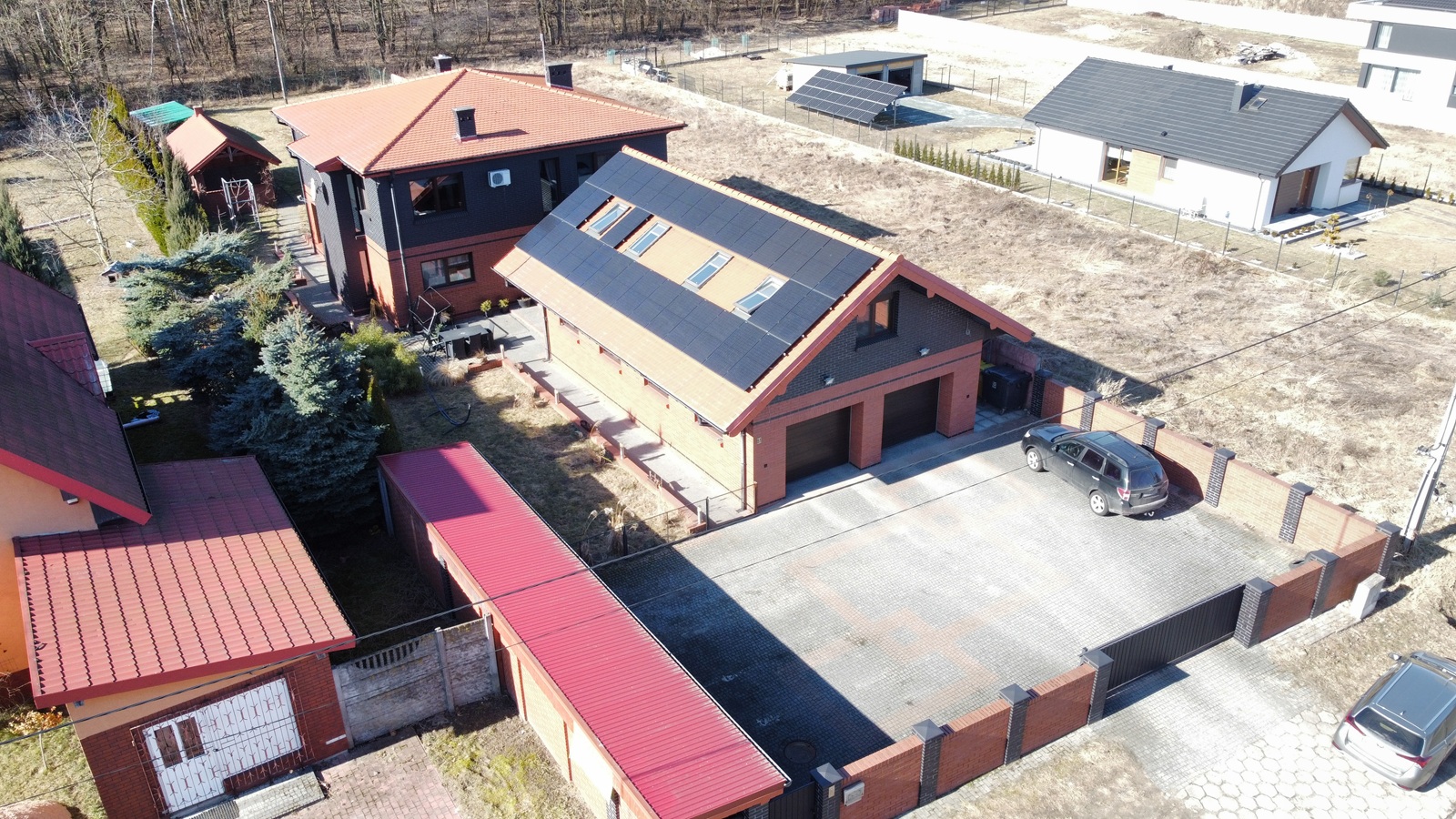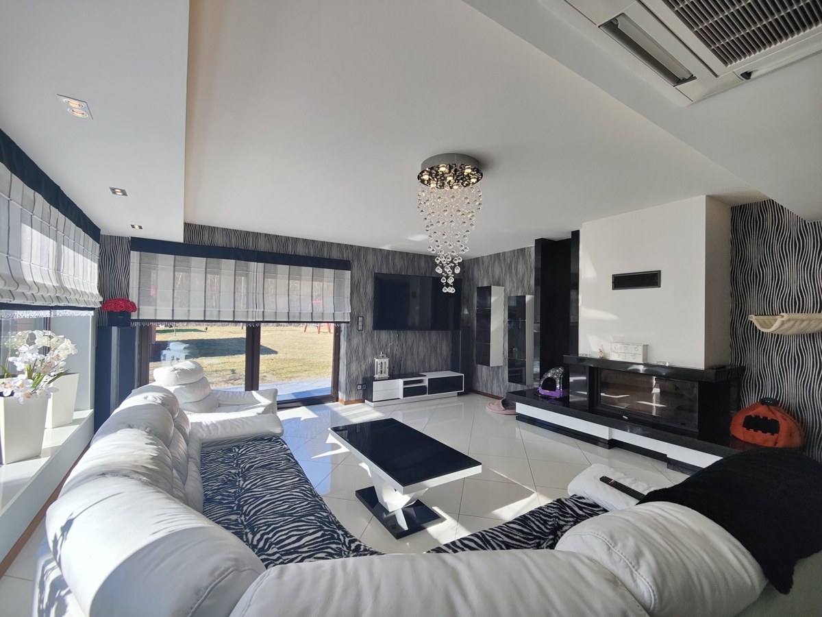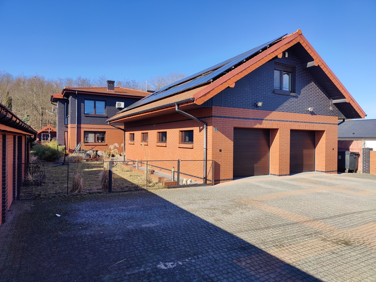 Na sprzedaż przestronny dom piętrowy w wysokim standardzie połączony z dużym budynkiem garażowym z częścią usługową, wyposażony w energooszczędne technologie gruntowej pompy ciepła i fotowoltaiki, w bezpośrednim sąsiedztwie lasu, zlokalizowany w miejscowości Kamienica, gm. Kazimierz Biskupi.
