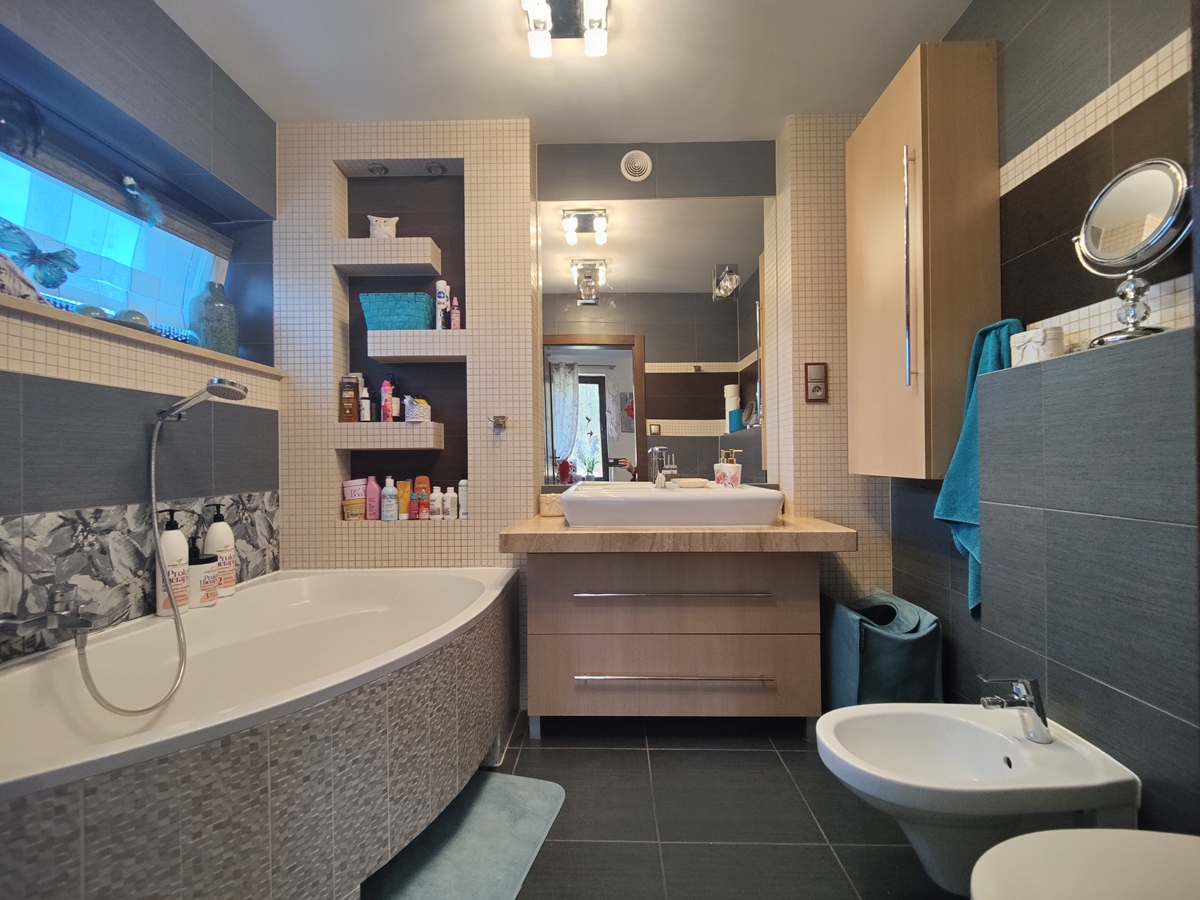 - piętro: 3 przestronne pokoje, łazienka z wanną, prysznicem i wc, pralnia, garderoba, przedpokój.