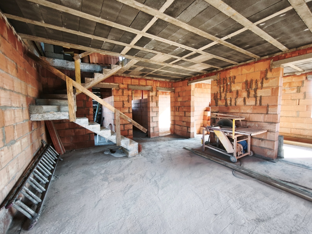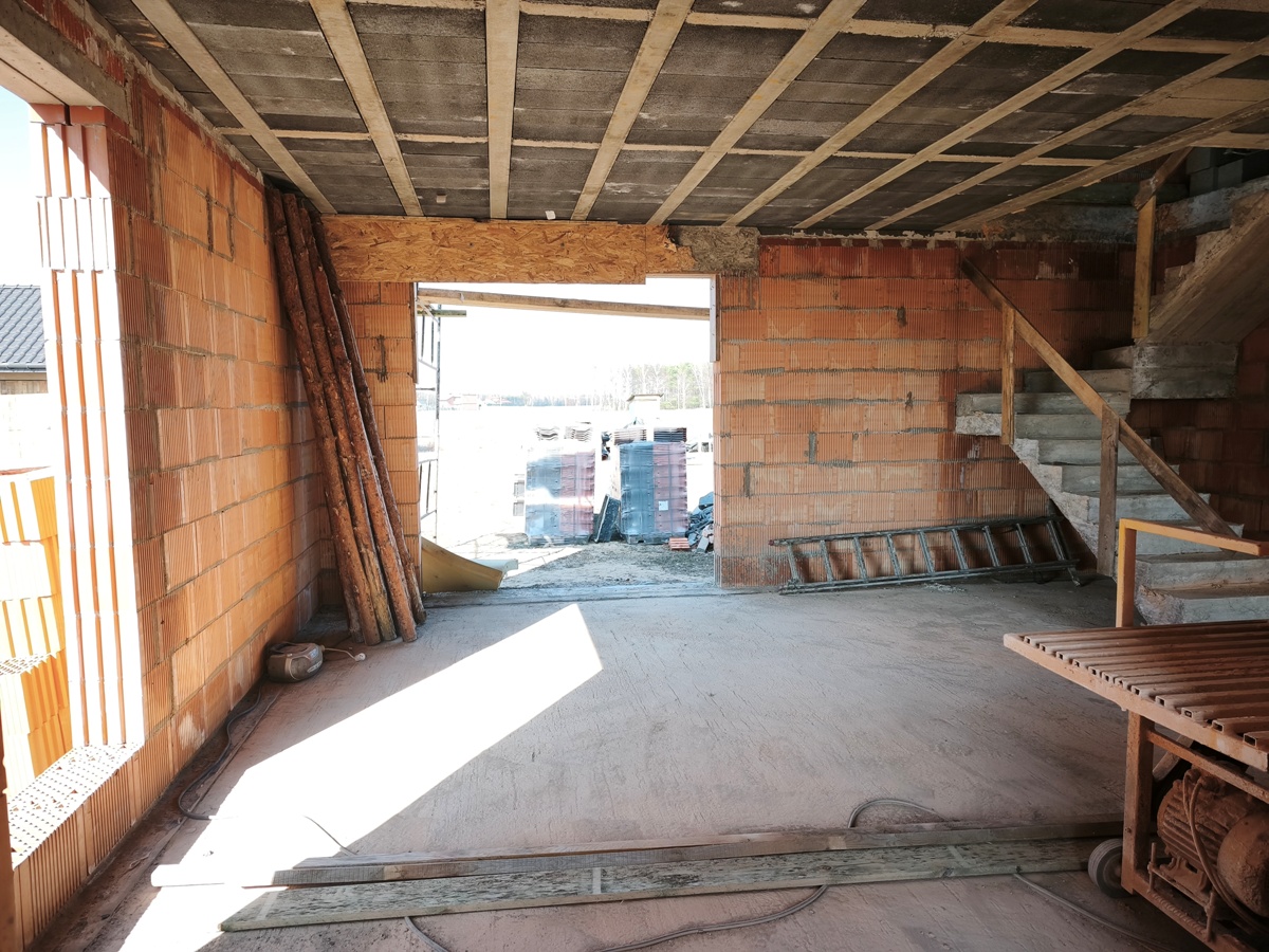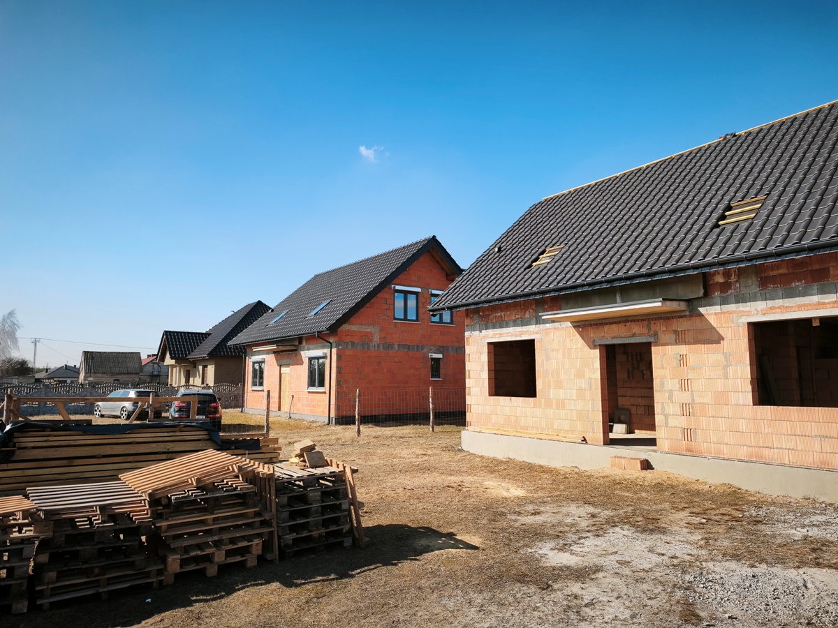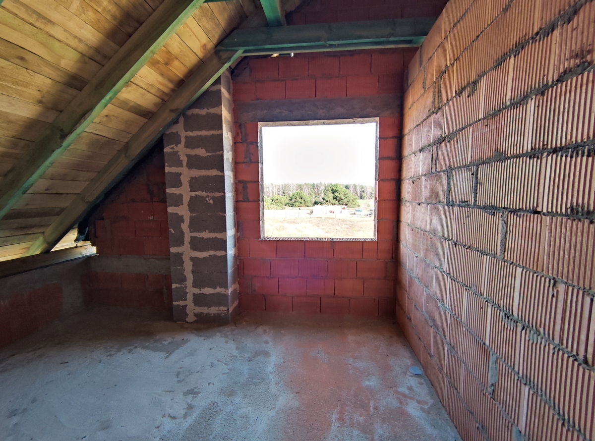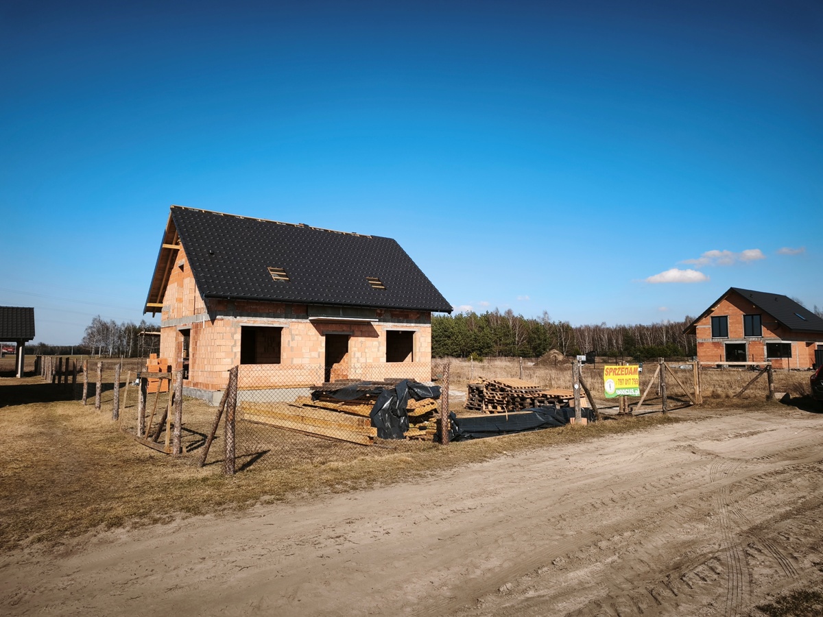 - Wolnostojący budynek mieszkalny parterowy z poddaszem użytkowym o powierzchni 133.40 m2, wybudowany w roku 2025/2026 wg projektu "Sowa 11 bez garażu" firmy Lelo Design. Budynek murowany z cegły czerwonej Porotherm 25 cm, dach dwuspadowy konstrukcji drewnianej, deskowany w całości, pokryty dachówka ceramiczną. Strop terriva, na powierzchni parteru wylany chudziak. Nieruchomość posiada dostęp do: energia elektryczna (przyłącze na działce), kanalizacja sanitarna oraz woda z sieci w trakcie realizacji.