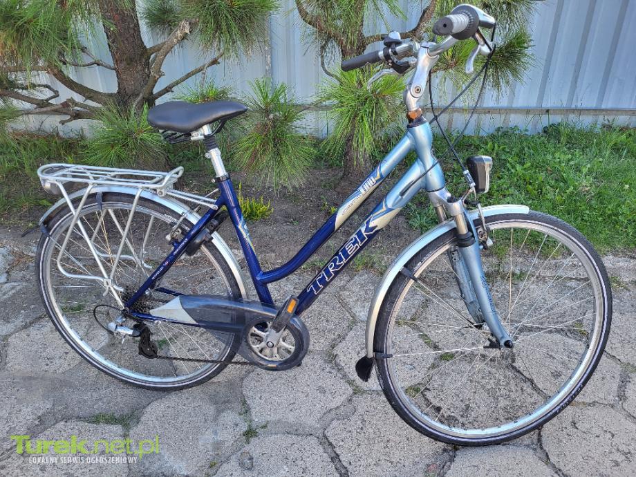 Sprzedam rower Trekkingowy Trek koła 28, rama aluminiowa, osprzęt Shimano biegi 3/8, oświetlenie sprawne, resorowany przód oraz siedzenie, stożkowe wzmocnione koła, opony stan bardzo dobry, blokada AXA, w zestawie pompka.