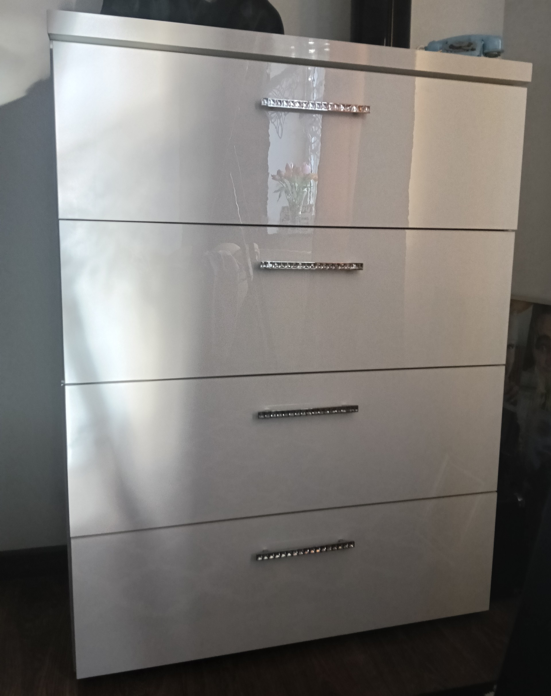 W skład mebli wchodzi komoda, szafa,biurko ( meble klejone ,solidne, połysk) duża okrągła pufa z pojemnikiem, narożnik czarny Velvet, krzesło Velvet,